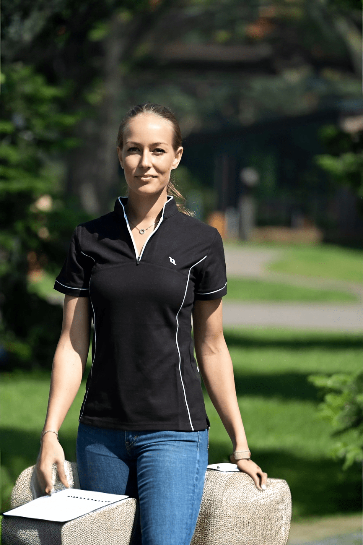 Perfekt trøje til daglig brug, med et design der passer lige så godt på kontoret som i stalden eller på golfbanen. Figurnær pasform og høj krave. Half-zip lynlås foran, som både er en flot detalje og gør det nemt at tage trøjen på og af.