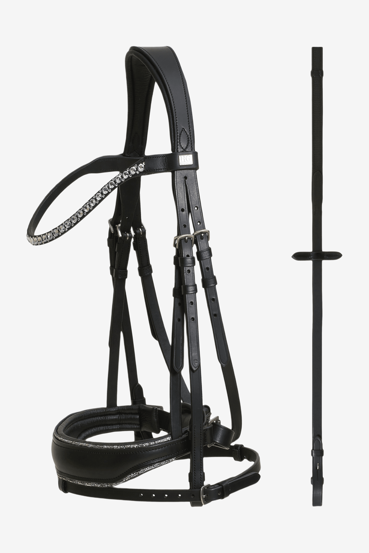 Trense fra Horse Guard. Horse Guard trense med pull-back lukning. Næsebåndet er polstret og forsynet med glitterdetaljer langs kanten. Buet pandebånd med sølvsten. Anatomisk nakkestykke med blød polstring for perfekt pasform og komfort.