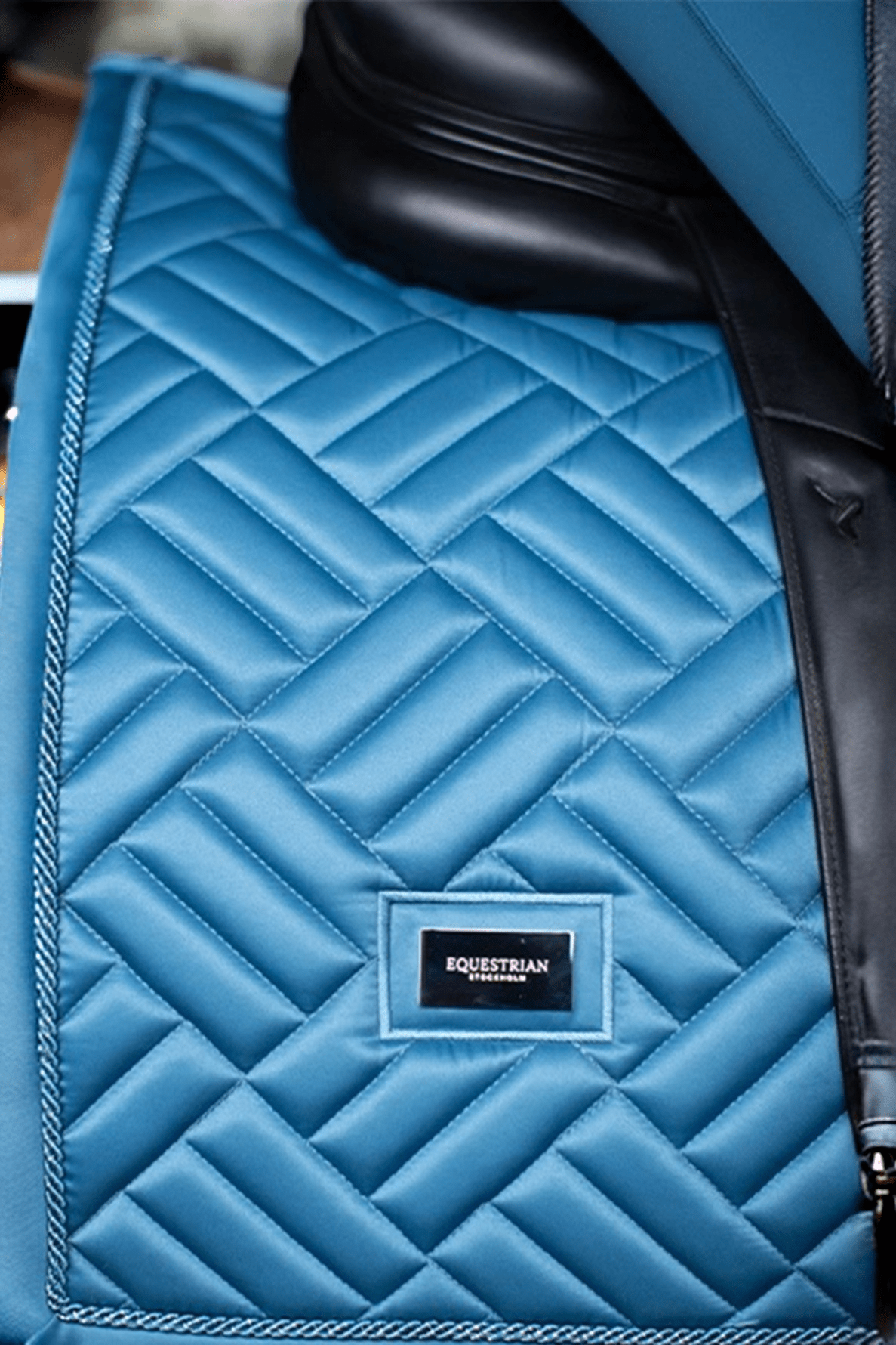 Stilfuldt og elegant underlag med labyrint quiltning. Farven er en dejlig blå med sølv og hvide detaljer. Equestrian Stockholm mærket er sølv.