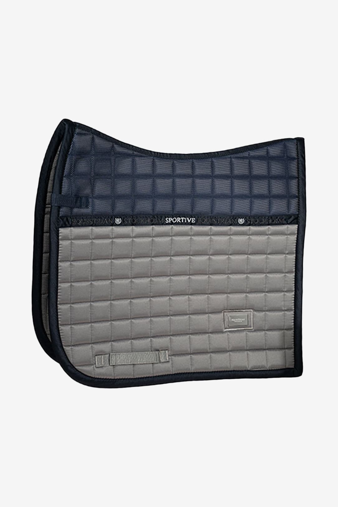 Ridedækken i blå farve. Dekoreret med emblem fra Equestrian Stockholm i krom.
