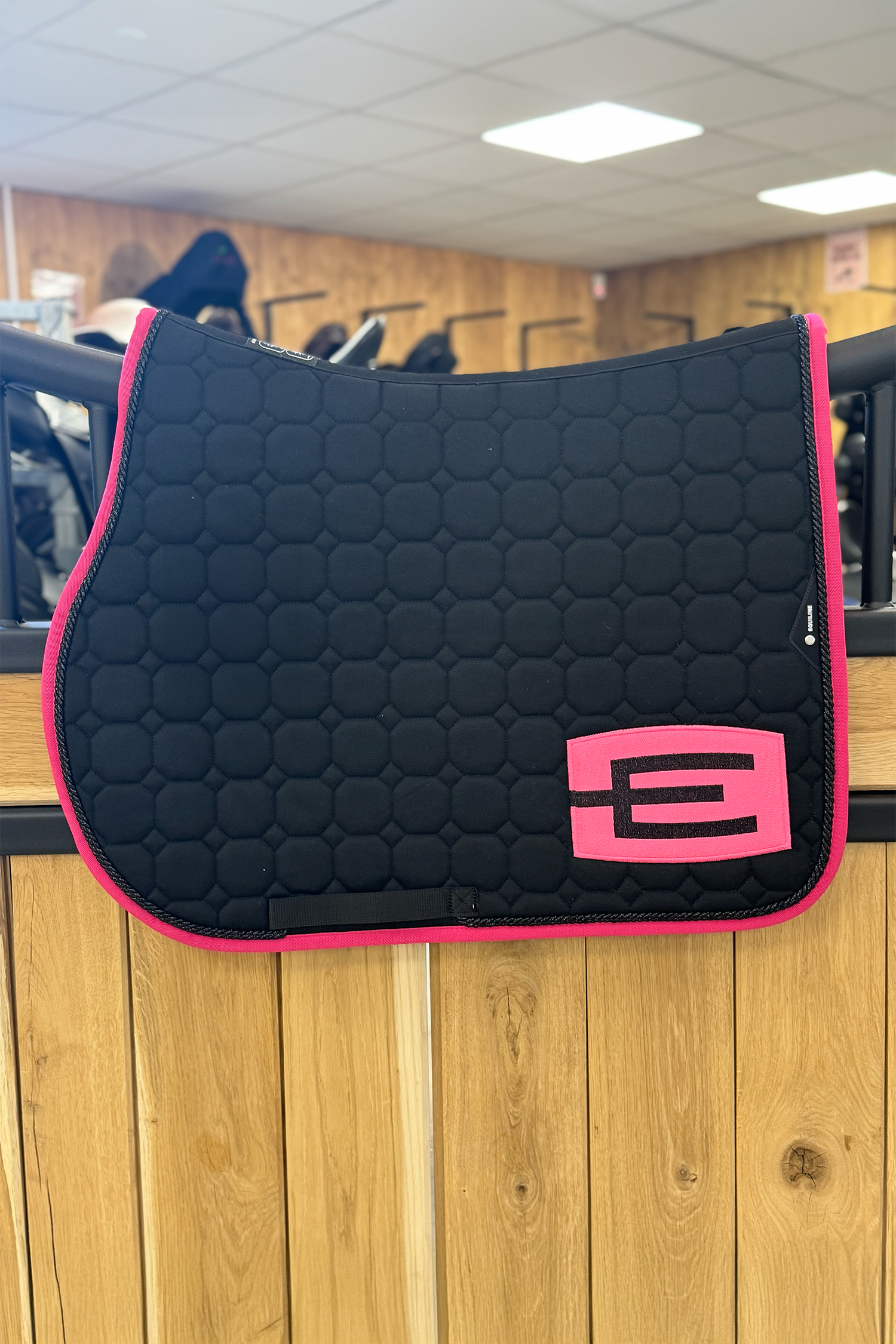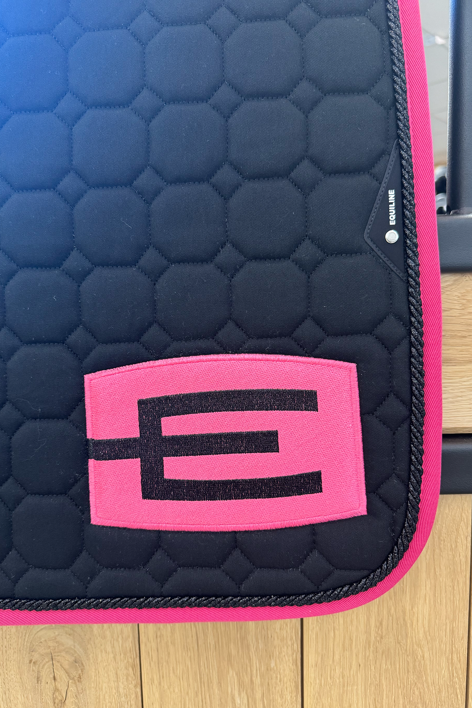Underlag i sort med sort glitrende paspol. Den populære E-logga i pink med sortfarvet E på venstre side.