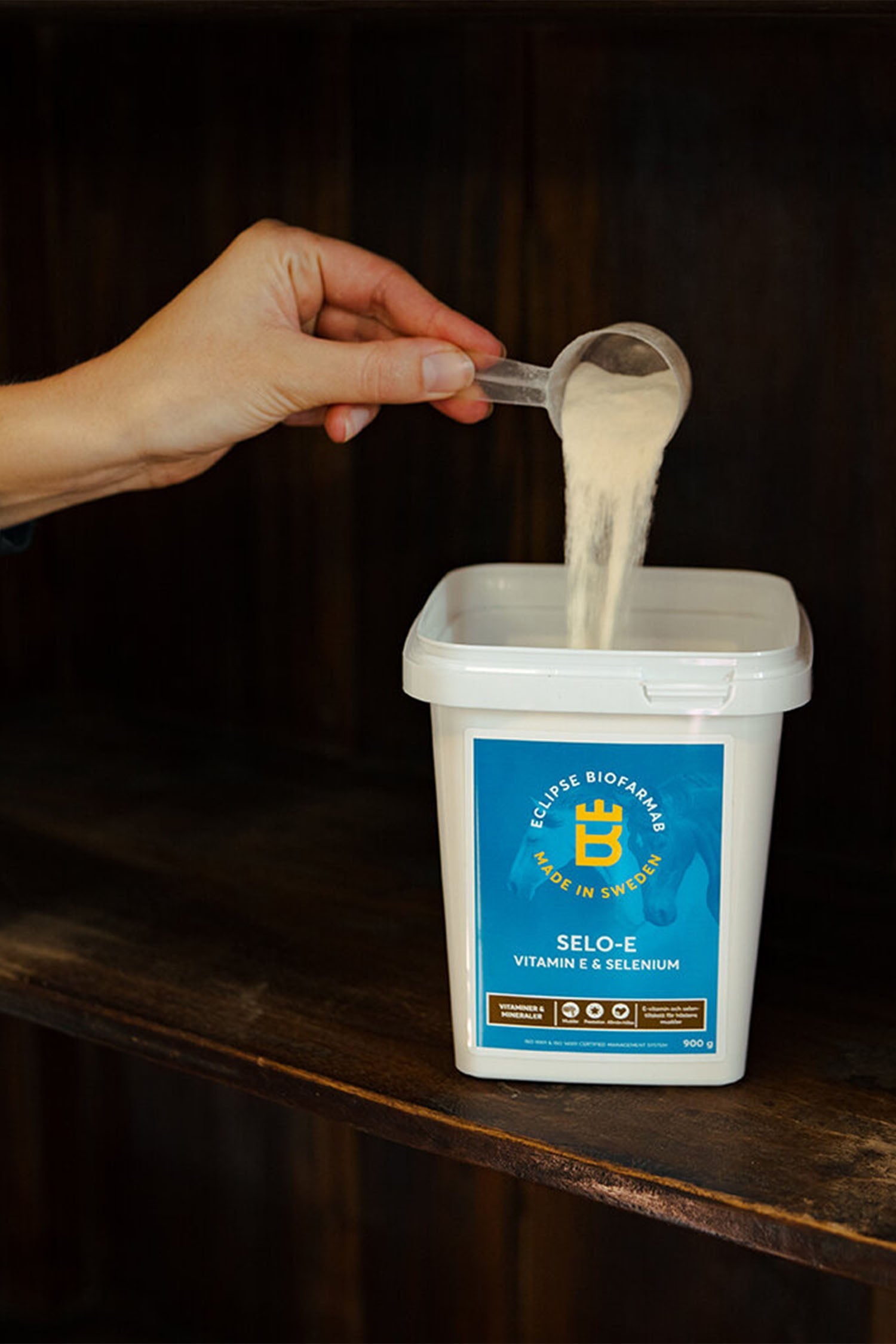 PRODUKTBESKRIVELSE Selentilskud med E-vitamin til hest i pulverform.