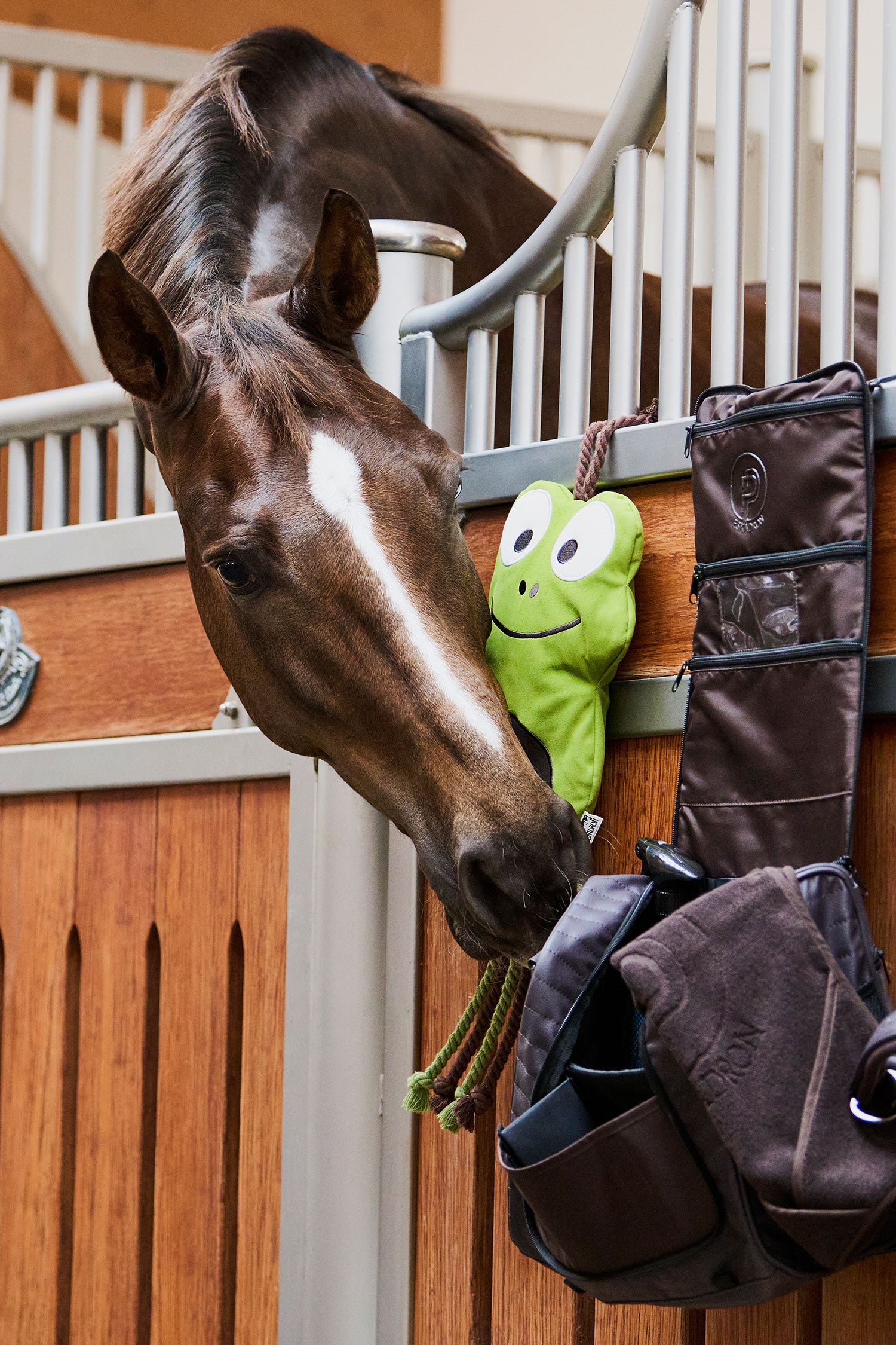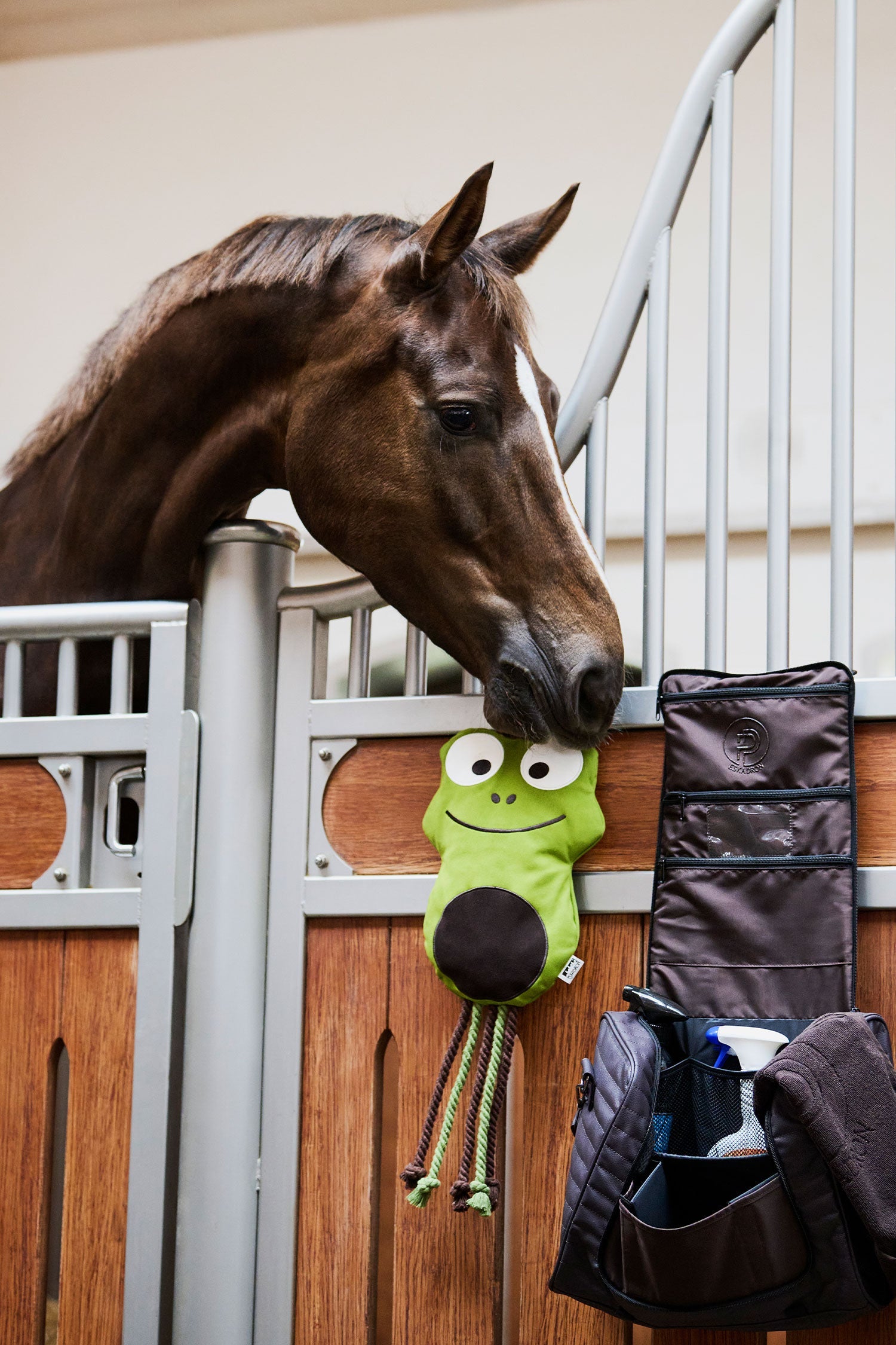 Hestelegetøj mod kedsomhed i stalden eller fold i sødt frødesign fra Eskadron. Fløjlsoverflade. Reb til at trække i og tygge på. Jutefyld.