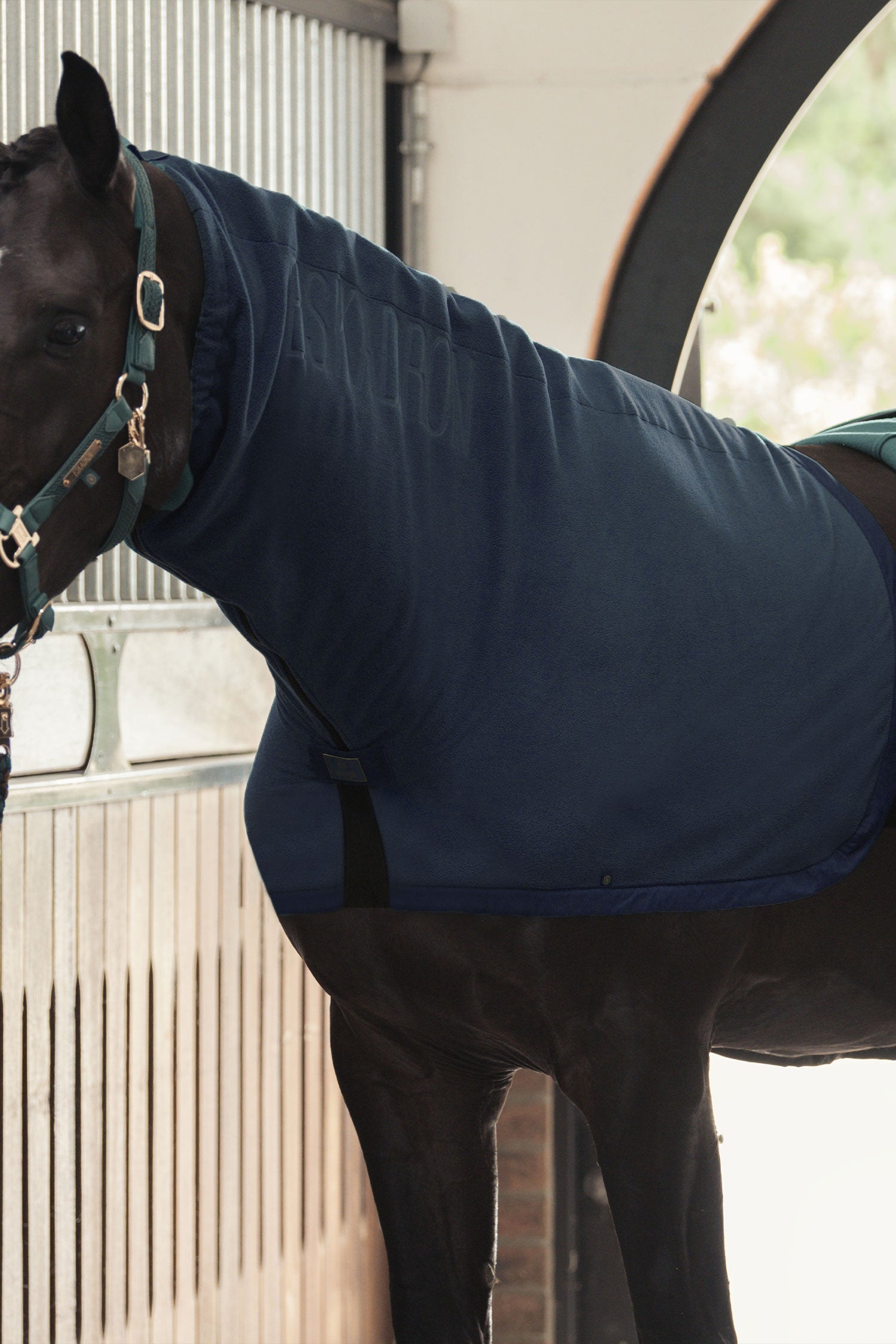 Let at fastgøre rundt om halsen med velcrolukninger. Ved hjælp af elastik er halsdelen også let at fastgøre på for eksempel grimen. Tæppet forhindres i at glide frem over hovedet ved hjælp af den forlængede del, der ender under tæppet.