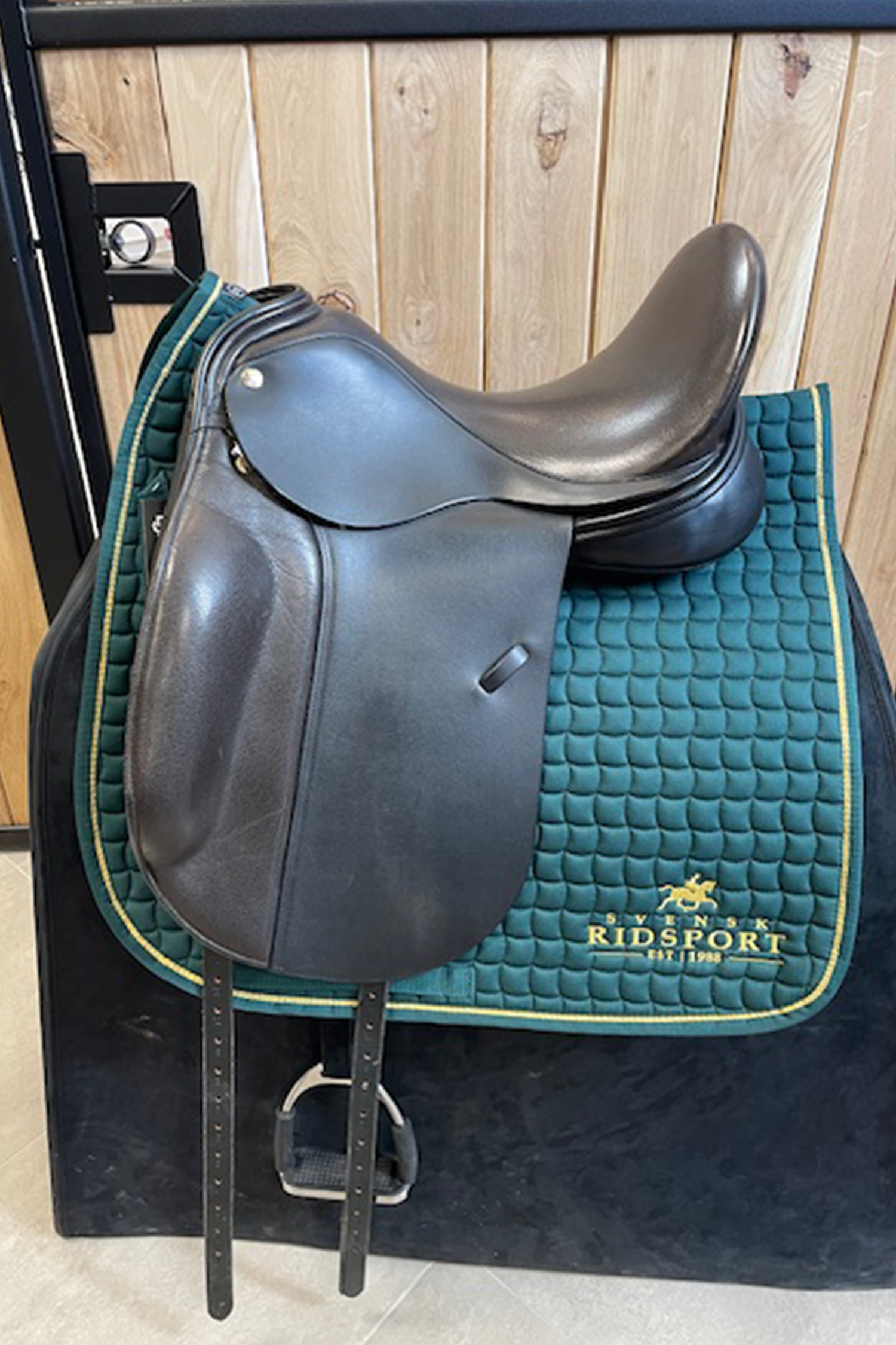 Engelsk kvalitetsadel med dybt sæde. Store knæklodser.