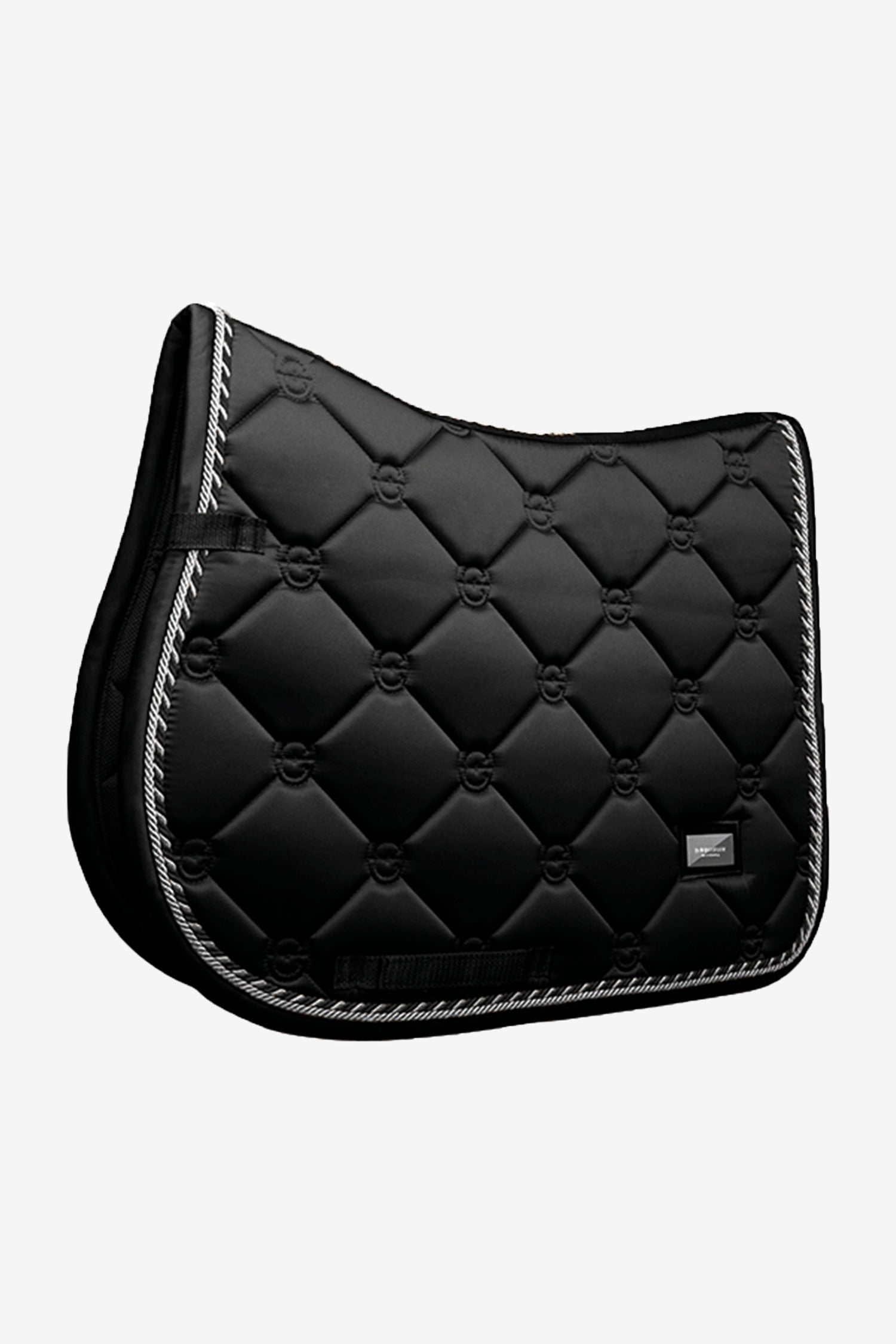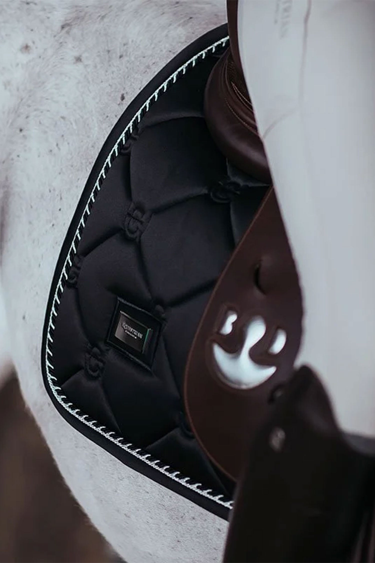 Eksklusivt sort springunderlag, perfekt til stævne- eller træningsbanen. Underlaget har et glansfuldt, smudsafvisende materiale med smukke sølvdetaljer. Indermaterialet har quick dry-funktion, som holder din hest tør under svedige træningspas. Matcher perfekt med andre produkter fra samme kollektion.