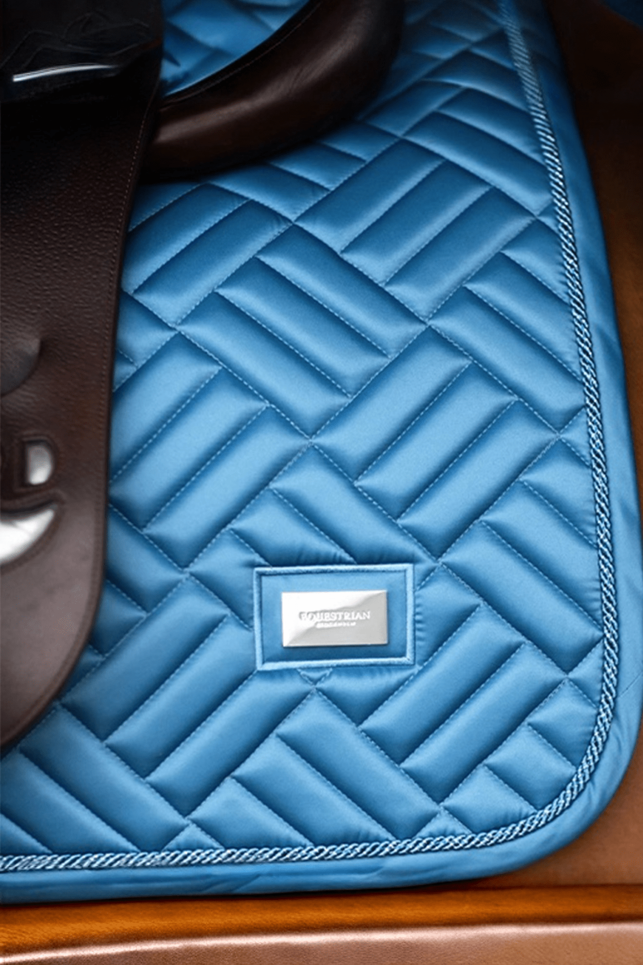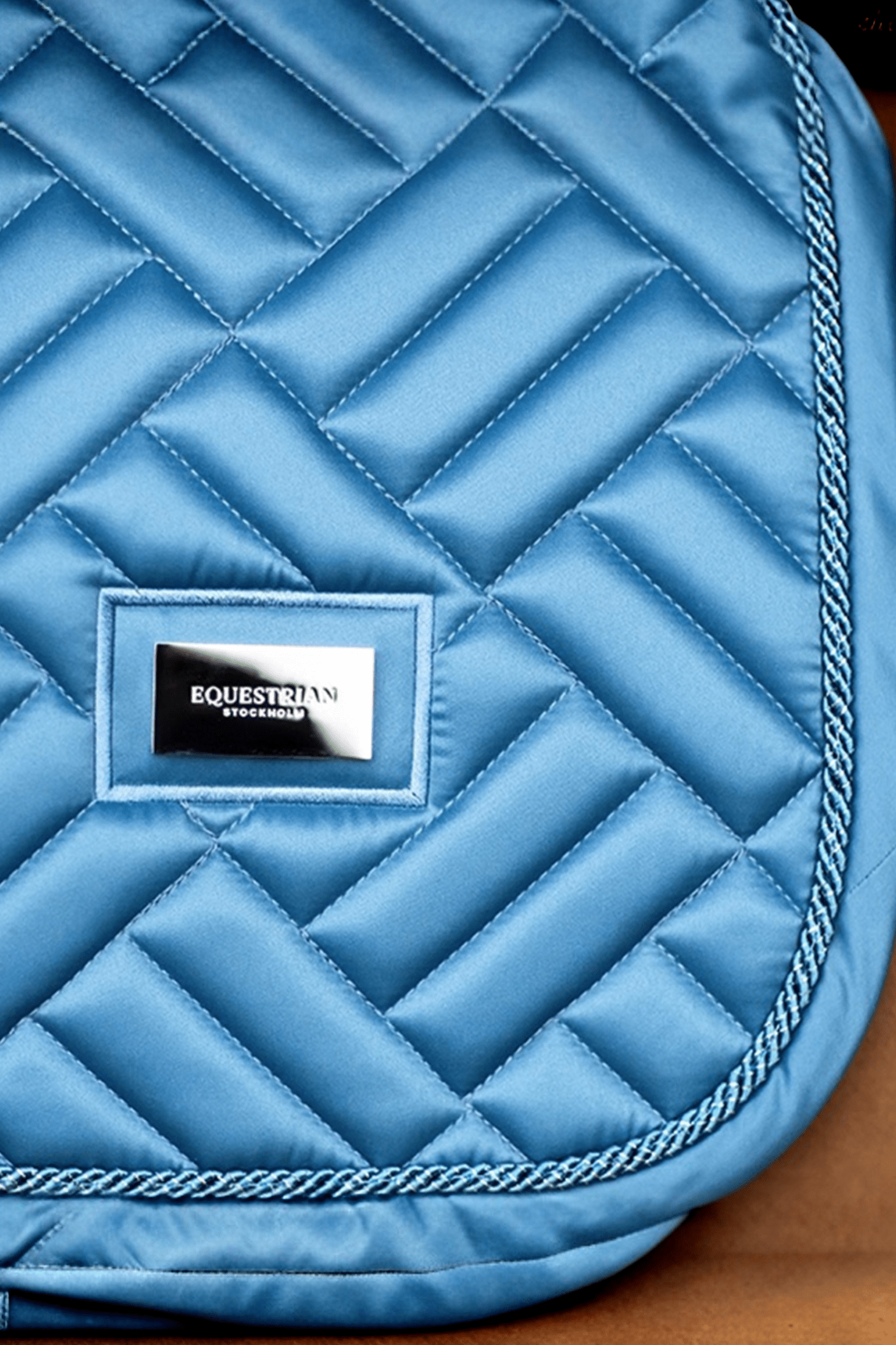 Emblemet på siden med Equestrian Stockholms logo er i roséguld. Underlaget er behandlet med High IQ cool komfort, hvilket giver underlaget hurtigtørrende og fugttransporterende egenskaber. Dette hjælper hesten med at holde sig tør og frisk længere under rideturen.
