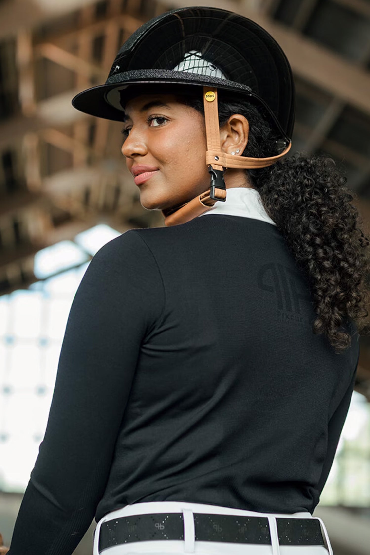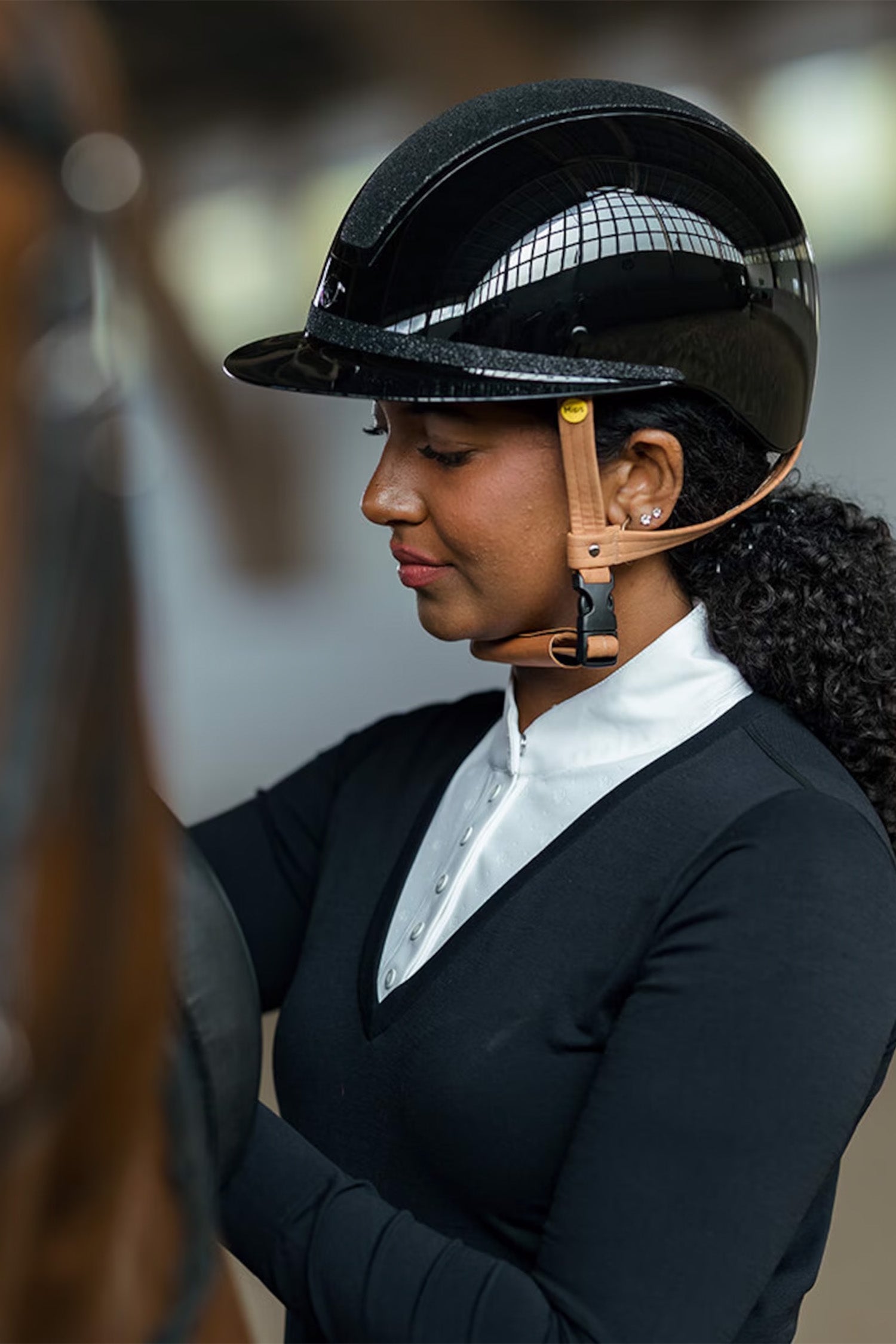 Oplev kombinationen af sikkerhed, komfort og eksklusivt design med denne elegante ridhjelm med MIPS-teknologi. Hjelmen er fremstillet i premium polykarbonat og udstyret med det integrerede MIPS-system, som giver ekstra beskyttelse mod rotationskræfter ved fald. Elegant, skinnende hjelm med bred solskærm, glitrende panel og smukt glitterbånd rundt om skærmen.