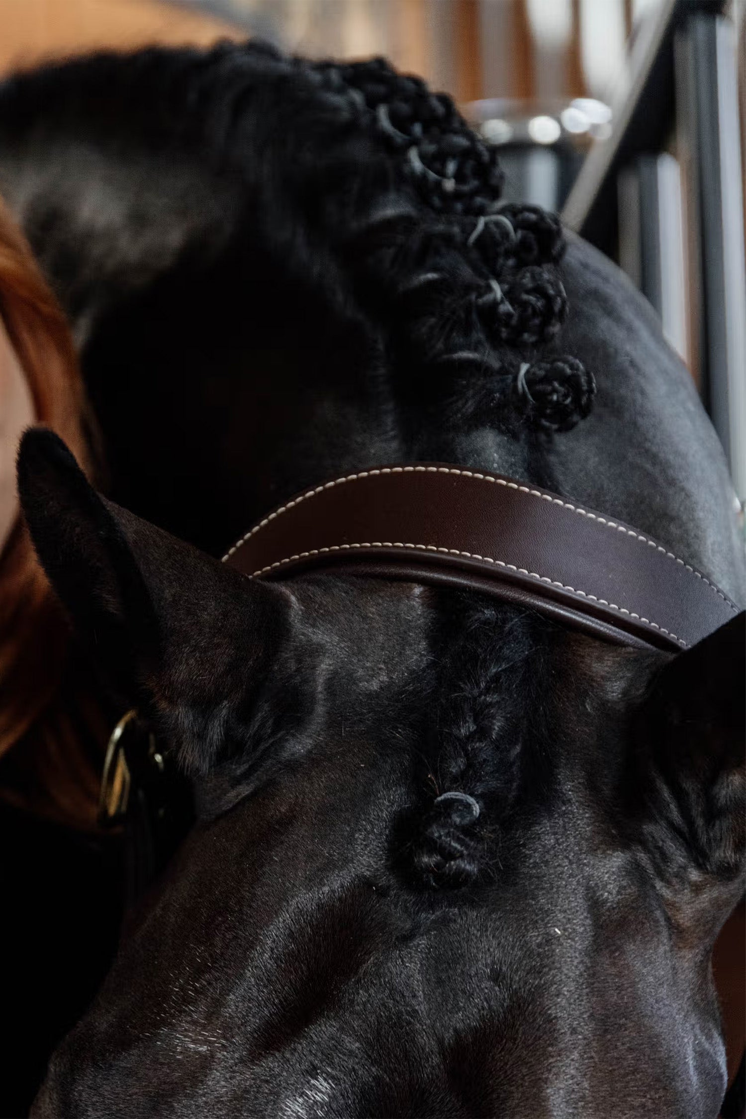 Den anatomiske form er udviklet for at aflaste trykket bag ørerne og følge hestens naturlige hovedform. Dette design bidrager til bedre pasform og mindre risiko for slid, hvilket gør nakkestykket ideelt til følsomme heste.