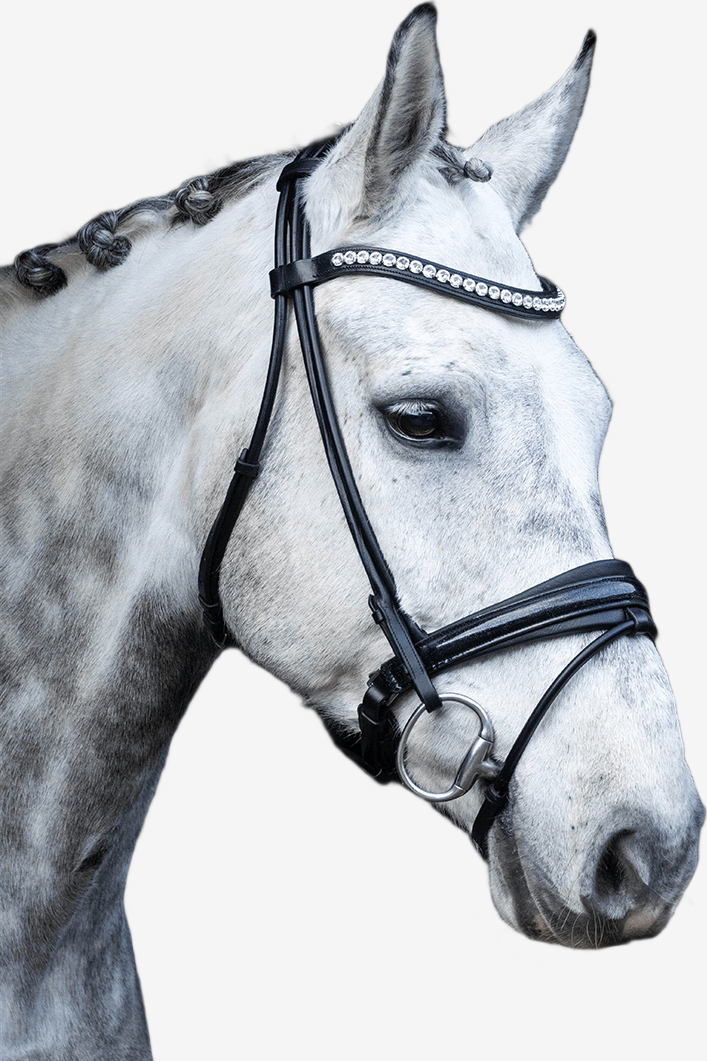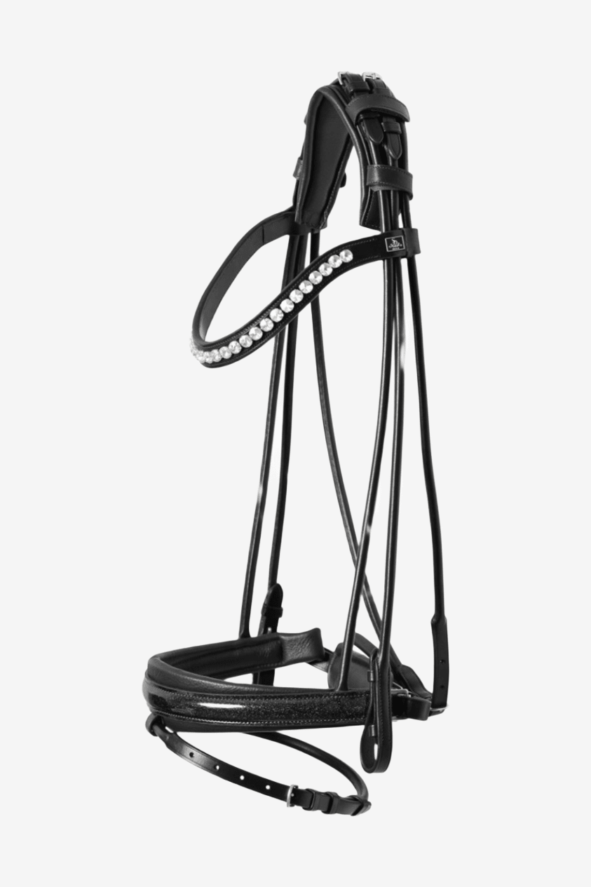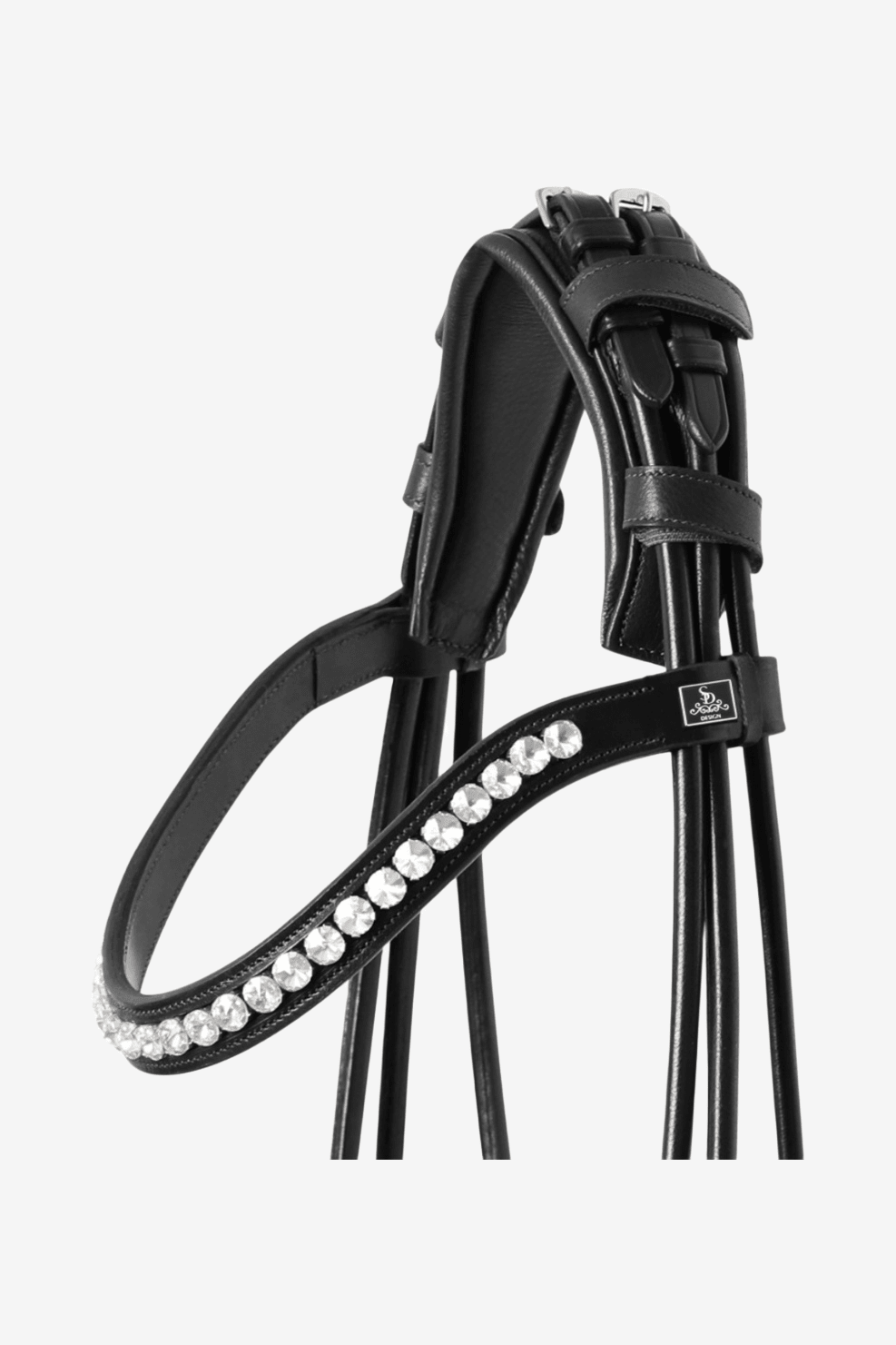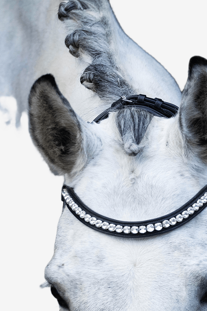 En meget stilfuld og elegant trense med ekstra blødt for i næsebåndet og nakkestykket! Det brede nakkestykke er meget trykfordelende over de følsomme nervebaner og giver plads til, at ørerne kan bevæge sig frit. Næsebåndet er lakeret med flot glitter og bredere på midten, og det smalner lidt af på siderne for at undgå at trykke for meget på nerverne og mindske risikoen for klem fra bidringene. Indadvendte spænder for et mere elegant look. Pandebåndet er svunget med en meget flot række af brede sten.