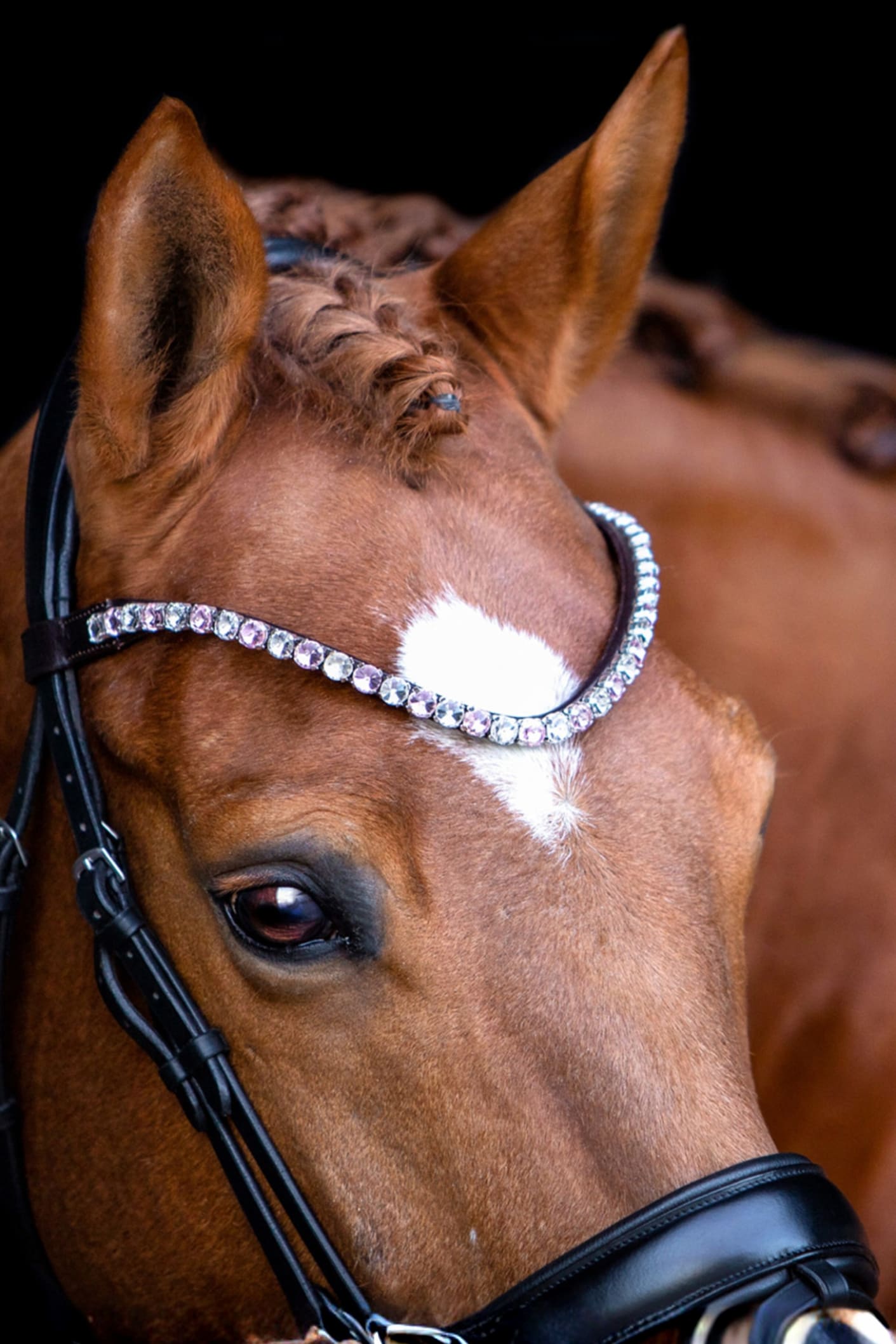 Dette elegante pandebånd er udsmykket med funklende 10 mm Rivoli-krystaller i en blanding af lyserød og hvid. Pandebåndet inkluderer en gratis pudseklud, så du kan polere krystallerne og holde dem funklende og skinnende. Pandebåndet er fremstillet af miljøvenligt læder, hvilket betyder, at der ikke er brugt kemikalier i garvningsprocessen.