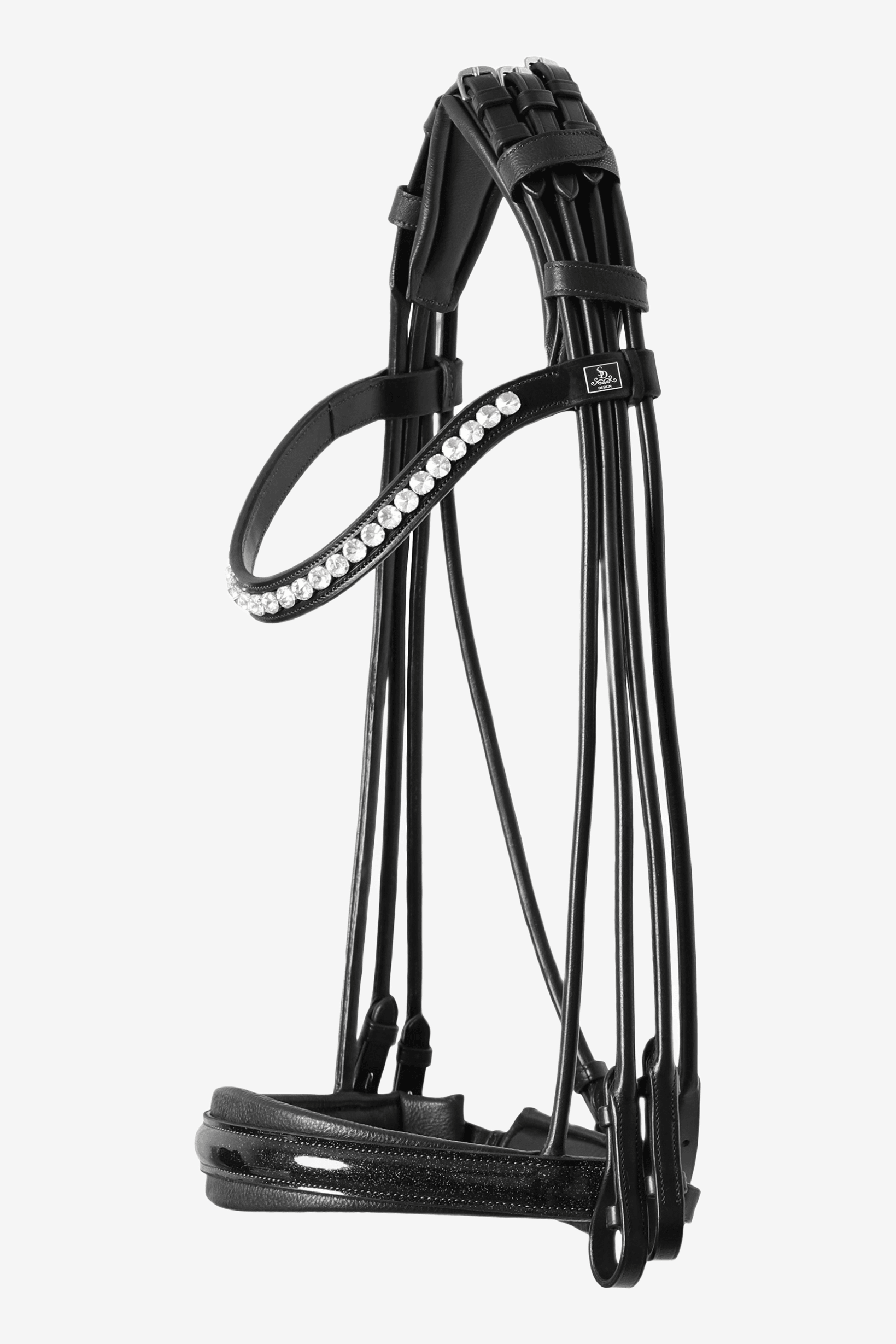 Det brede nakkestykke fordeler trykket meget godt over de følsomme nervebaner og giver plads til, at ørerne kan bevæge sig frit. Næsebåndet er lakeret med flot glitter og er bredere på midten, hvor det smalner lidt ind i siderne for at undgå for meget tryk på nerverne og mindske risikoen for at blive klemt af bidringene. Indadvendte spænder for et mere elegant look. Pandebåndet er buet med en meget flot række af store sten.
