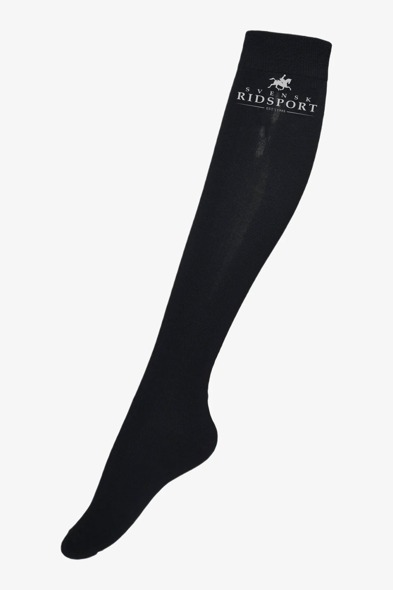 Stilfulde, tynde og behagelige ridestømper fra Svensk Ridsport til både damer og herrer. Svensk Ridsport logo samt tekst øverst på skaftet.