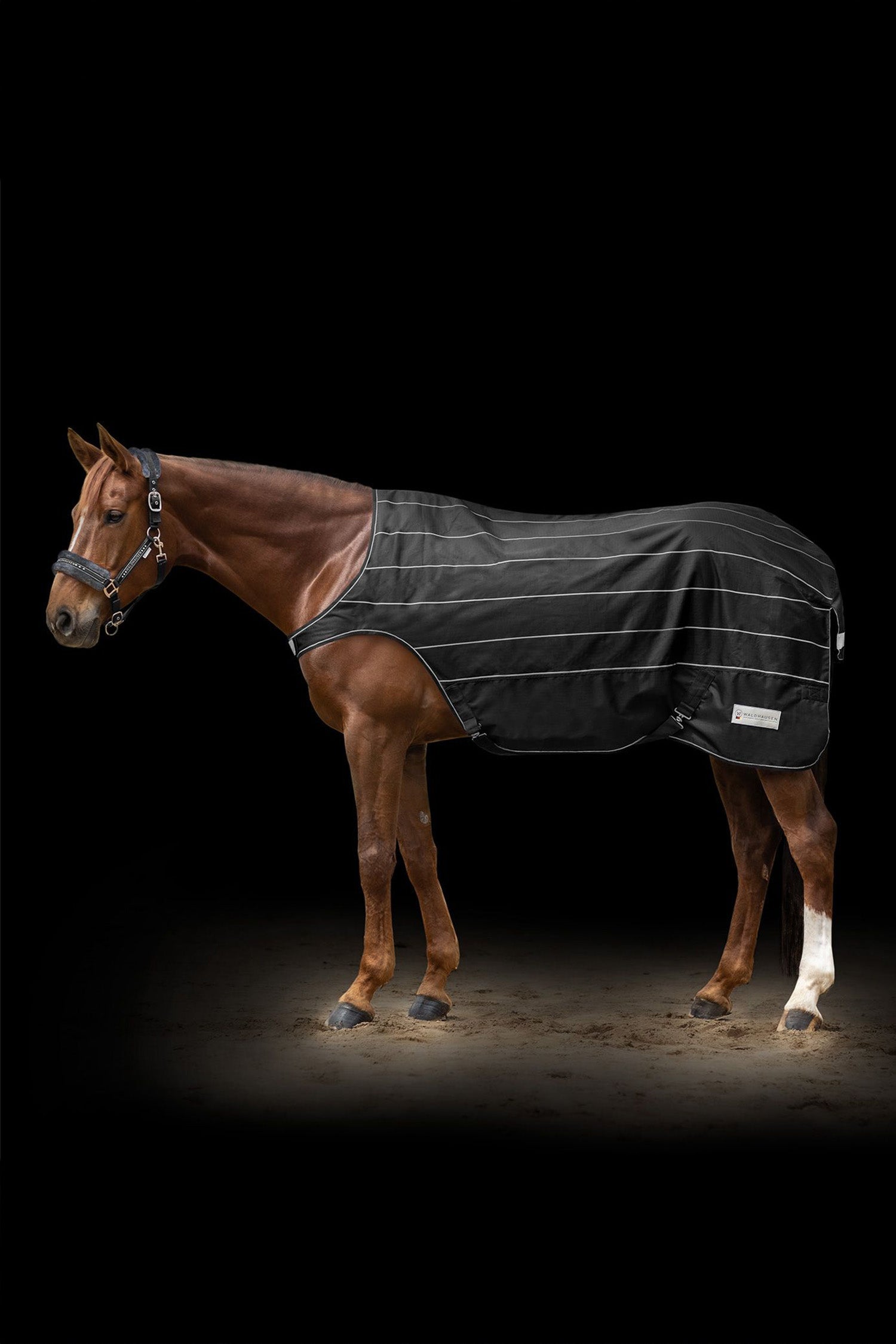 Indersiden er foret med et blødt, svedabsorberende fleecefor, der hjælper hesten med at tørre hurtigt og holde sig varm uden at blive fugtig. De indvævede refleksstriber langs hele dækkenet giver øget synlighed og tryghed i mørke.