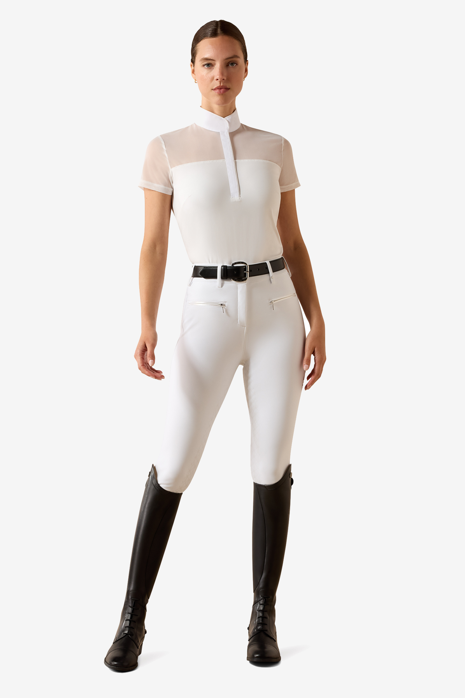 Den kropsnære pasform er tilpasset konkurrenceryttere og giver et smigrende udtryk, samtidig med at den tilbyder fuld bevægelsesfrihed i sadlen. Det tekniske materiale hjælper med at regulere kropstemperaturen under intense øjeblikke og holder dig kølig, når det bliver varmt. Den lugtregulerende funktion bidrager til en frisk fornemmelse under lange konkurrencedage, mens den smudsafvisende overflade gør tøjet lettere at holde rent.
