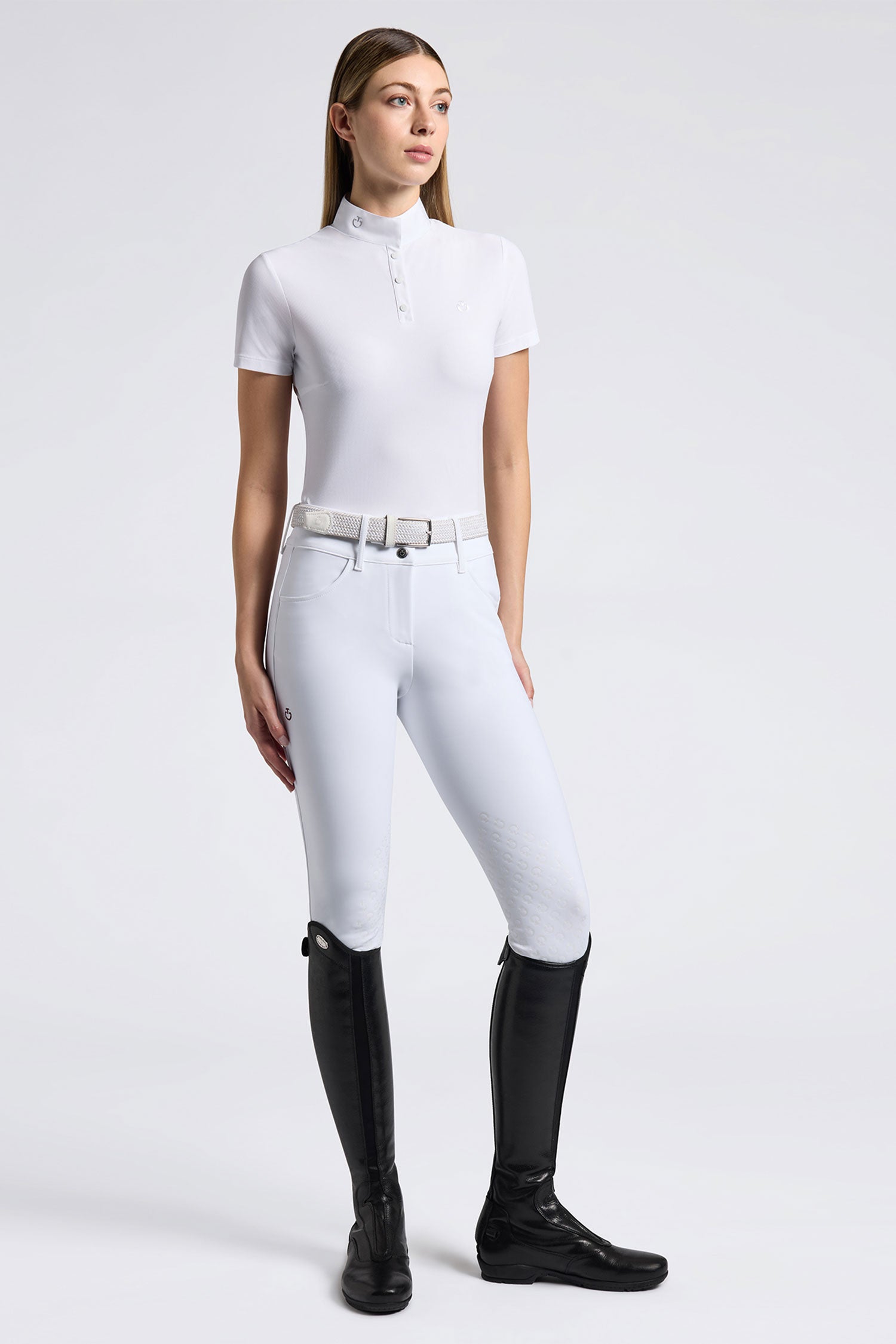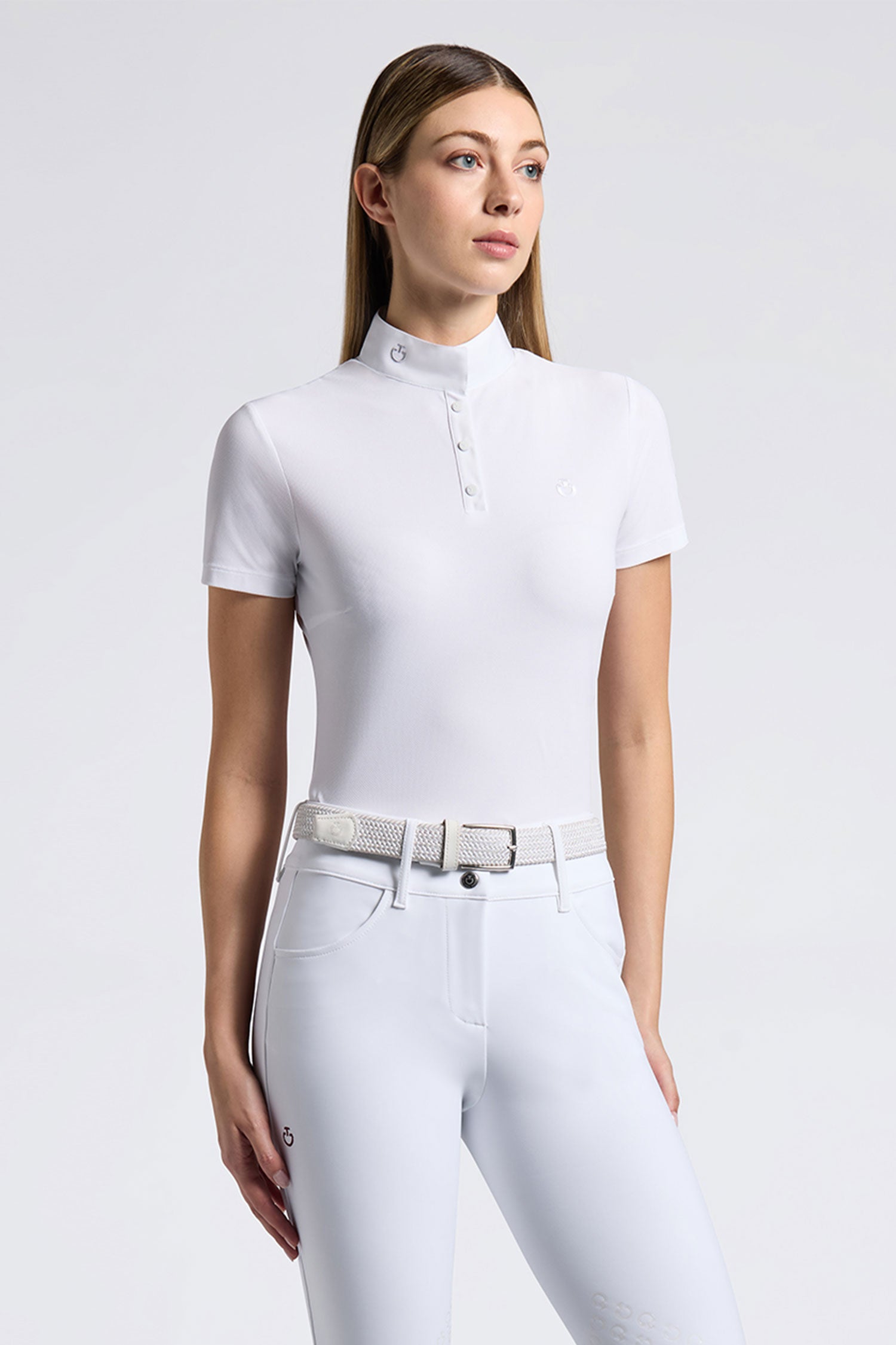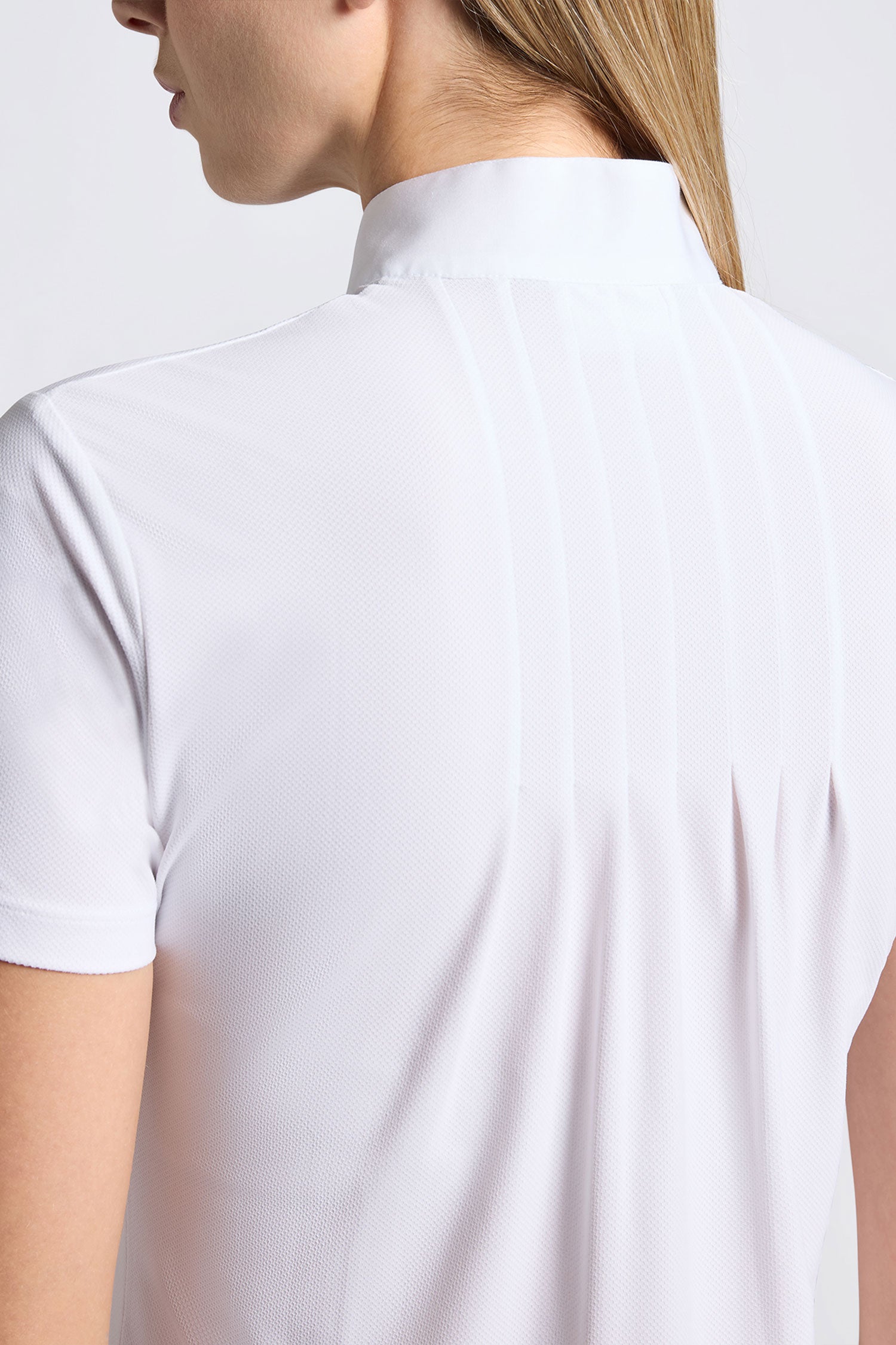 Den elegante og funktionelle konkurrencetop fra Cavalleria Toscana er det perfekte valg til konkurrence og træning, hvor både komfort og stil er af største betydning. Fremstillet i et teknisk, strækbart materiale, der ånder, giver denne konkurrencetop en uovertruffen pasform og bevægelsesfrihed under ridetimerne. Det kortærmede design gør den ideel til varmere vejr, samtidig med at den tilbyder et sofistikeret og professionelt udseende.