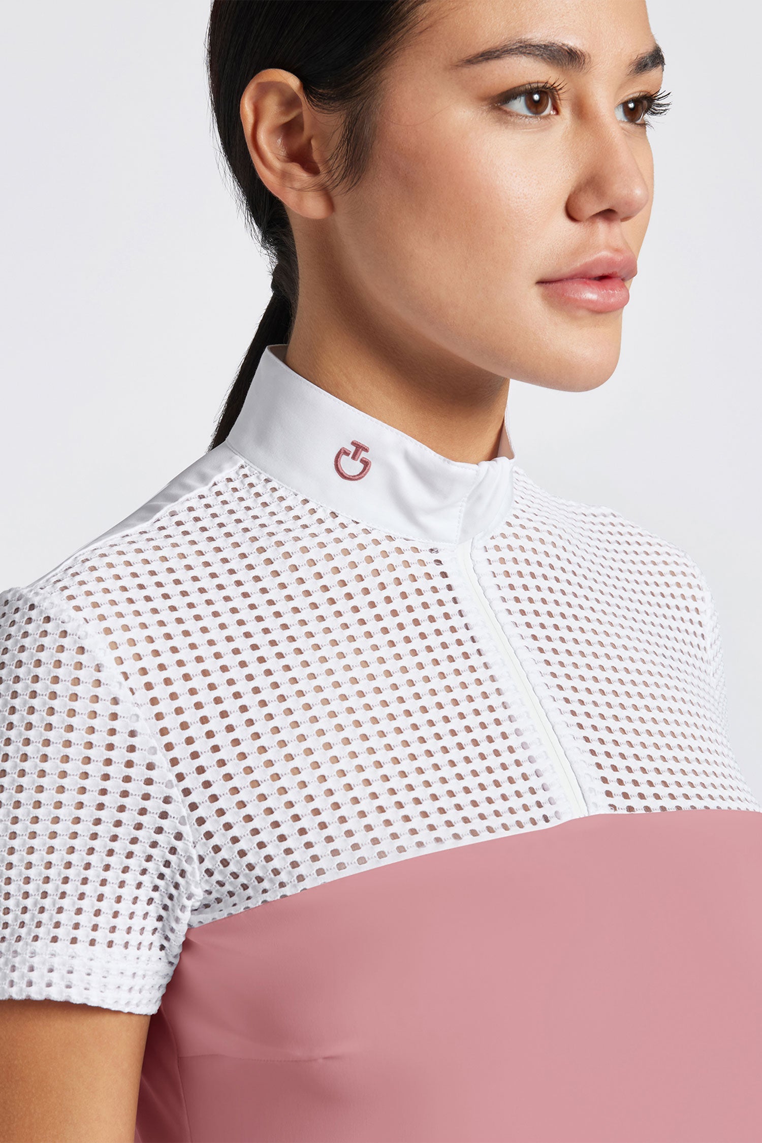 Perforeret konkurrenceskjorte til kvinder fra Cavalleria Toscana, der har et sporty moderne look, som smigrer. Materialet er fugttransporterende, hurtigtørrende og lugthæmmende.