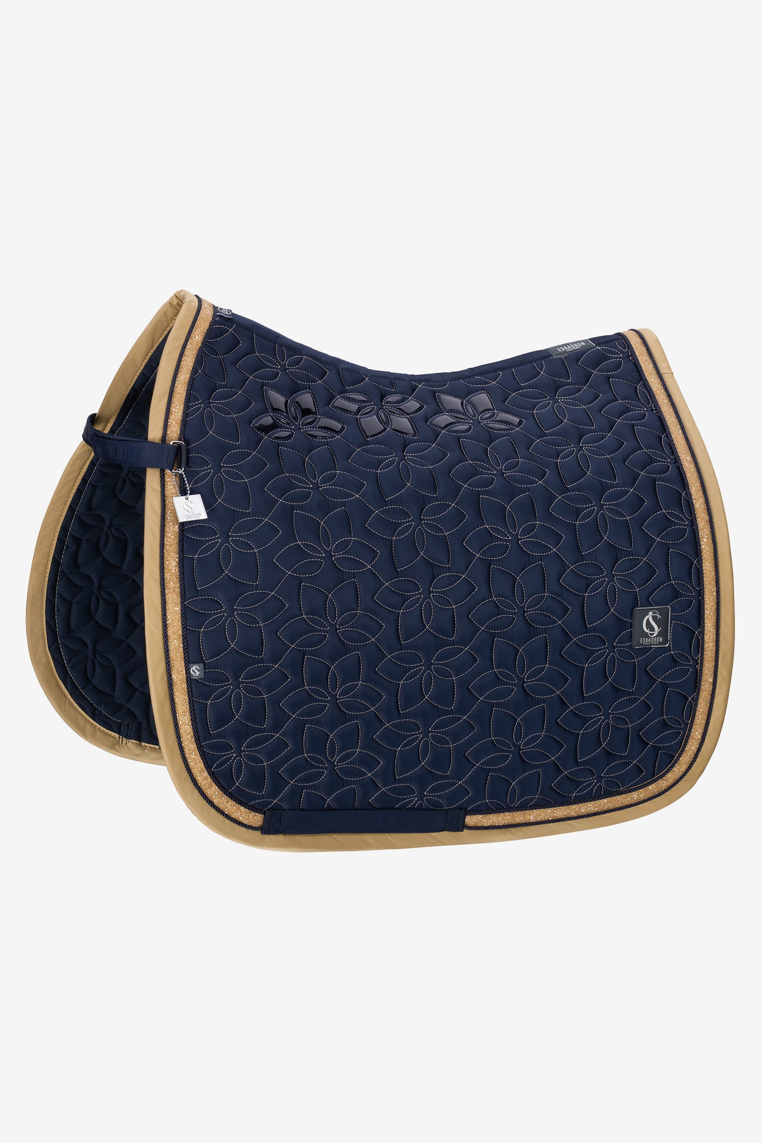 Designet forstærkes af en elegant kombination af paspel og dekorative sten sammen med en blank kant, der giver et eksklusivt helhedsindtryk. Underlaget er desuden udstyret med tre separate kanaler til gjordstropper samt et aftageligt Innostrap-system, der gør det nemt at tilpasse den forreste fastgørelse ved sadlen.