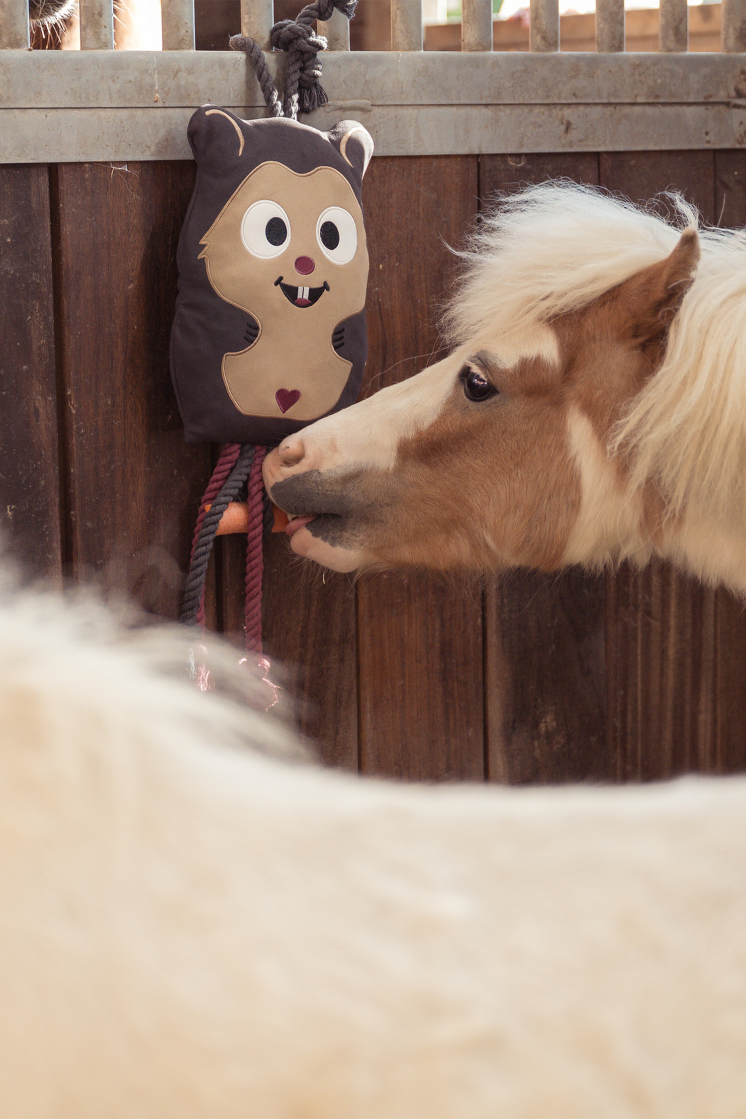 Legetøjet har en slidstærk overflade i kunstlæder og er fyldt med bæredygtig, ubehandlet trærulle, som giver en behagelig fornemmelse og passende tyngde. De solide reb er perfekte for hesten at trække i, bære rundt på og smågnave i. Med en højde på cirka 30 cm er den ideel at hænge i boks, staldgang eller mindre fold, hvor den hurtigt bliver et værdsat aktiveringslegetøj.