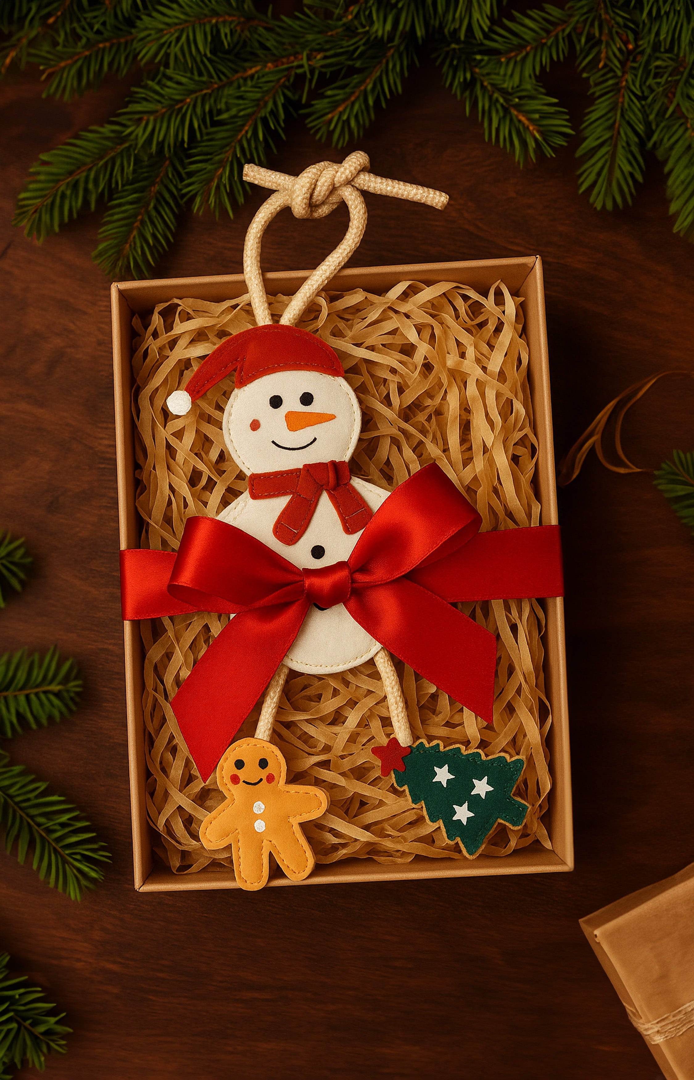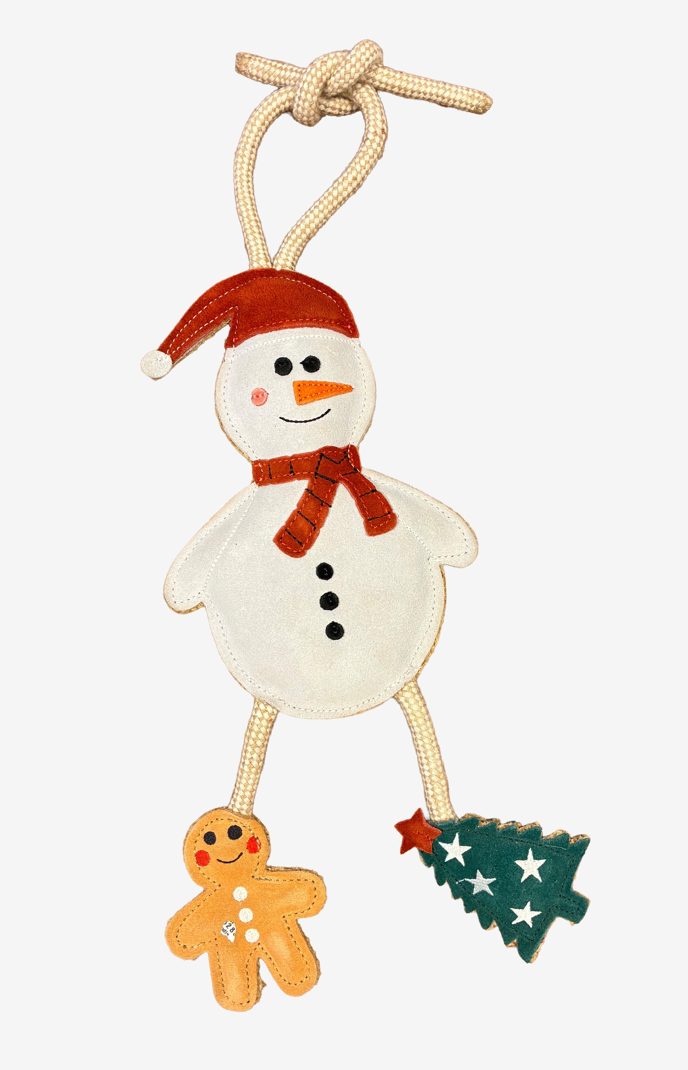 En julegave og ny ven til din hest. Hyggeligt hestelegetøj i form af en snemand med hængende detaljer af peberkage og juletræ.