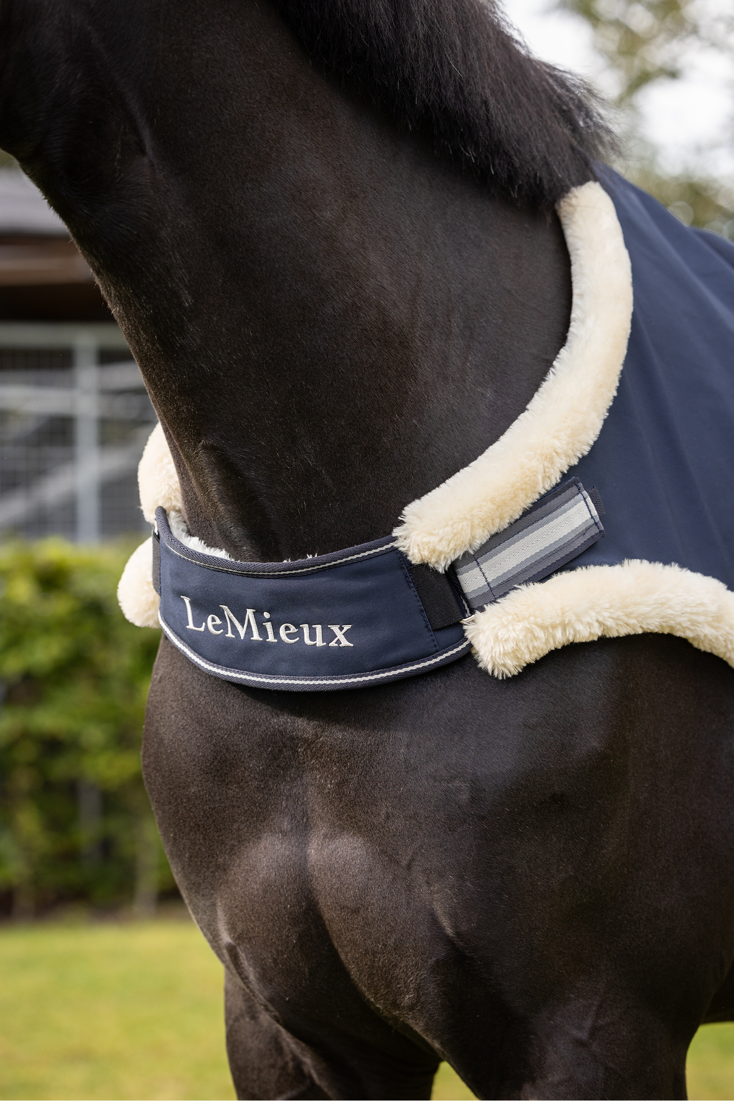 Den smart udskårne skulderdel giver maksimal bevægelsesfrihed for skulder og forben, så hesten kan tage fuldt skridt både på volte og i skrittmaskine uden at blive begrænset af dækkenet. Omkring skulder og bringe er dækkenet foret med luksuriøs kunstpels, hvilket mindsker risikoen for slid og giver ekstra komfort mod følsomme områder.