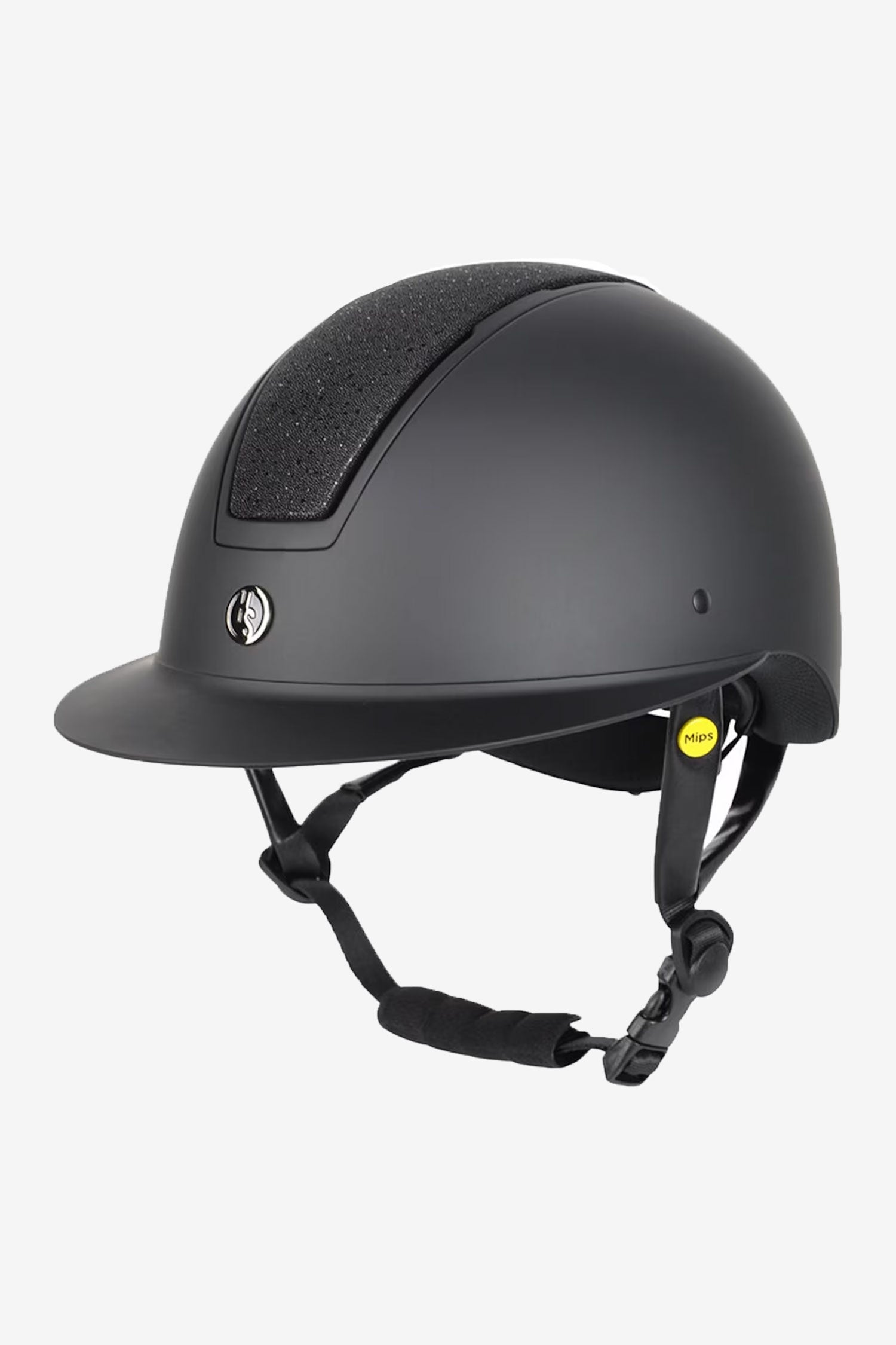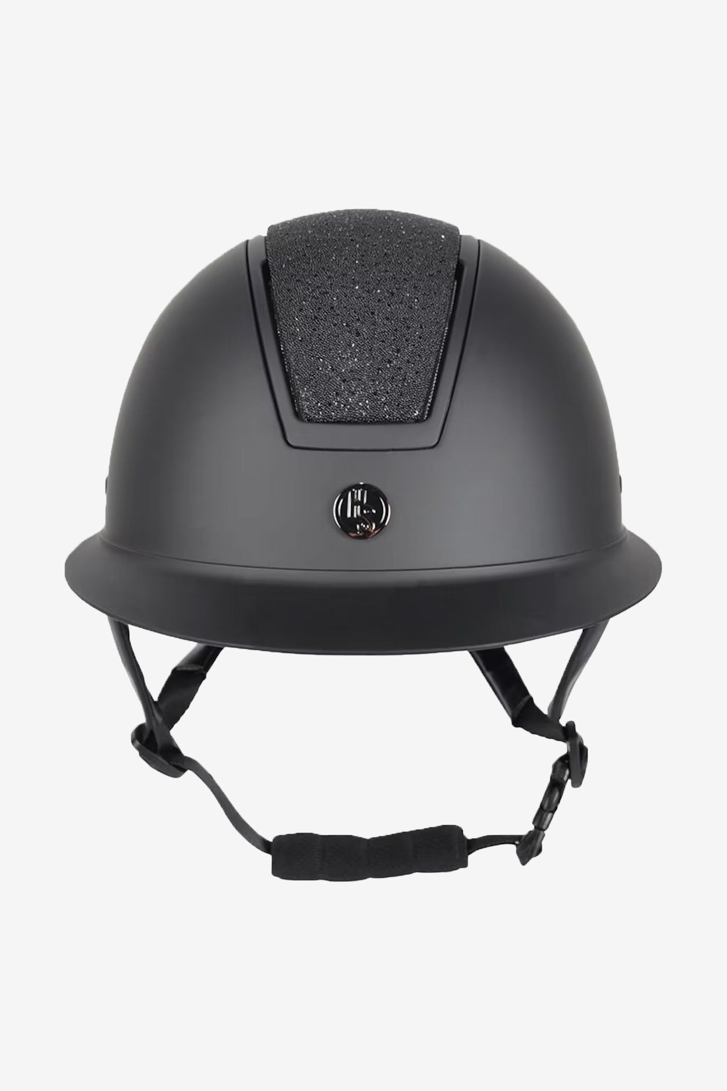 Elegant hjelm med bred skygge, mat overflade, panel dekoreret med sort glimmer og i alt seks ventilationsåbninger. Hagerem med trepunktsfæste i syntetisk læder, quick-release spænde og en blød tunnel af Cooldry-materiale.