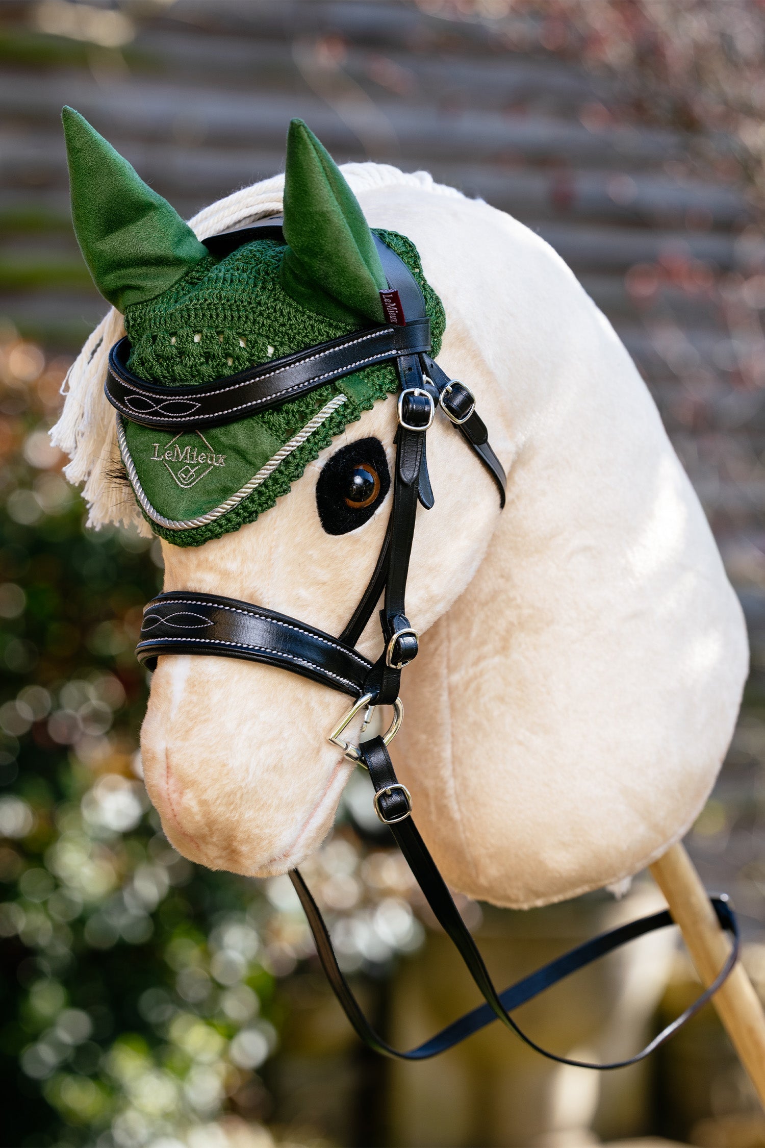Hobby Horse Fluehætte Hunter Green er en detaljeret, miniatyrversion af LeMieuxs klassiske fluehætte og et perfekt supplement til din käpphests eller Toy Ponys udstyr. Den er håndhæklet med fint mønster og har bløde ører i ruskindslignende materiale, som giver både komfort og et realistisk udseende.