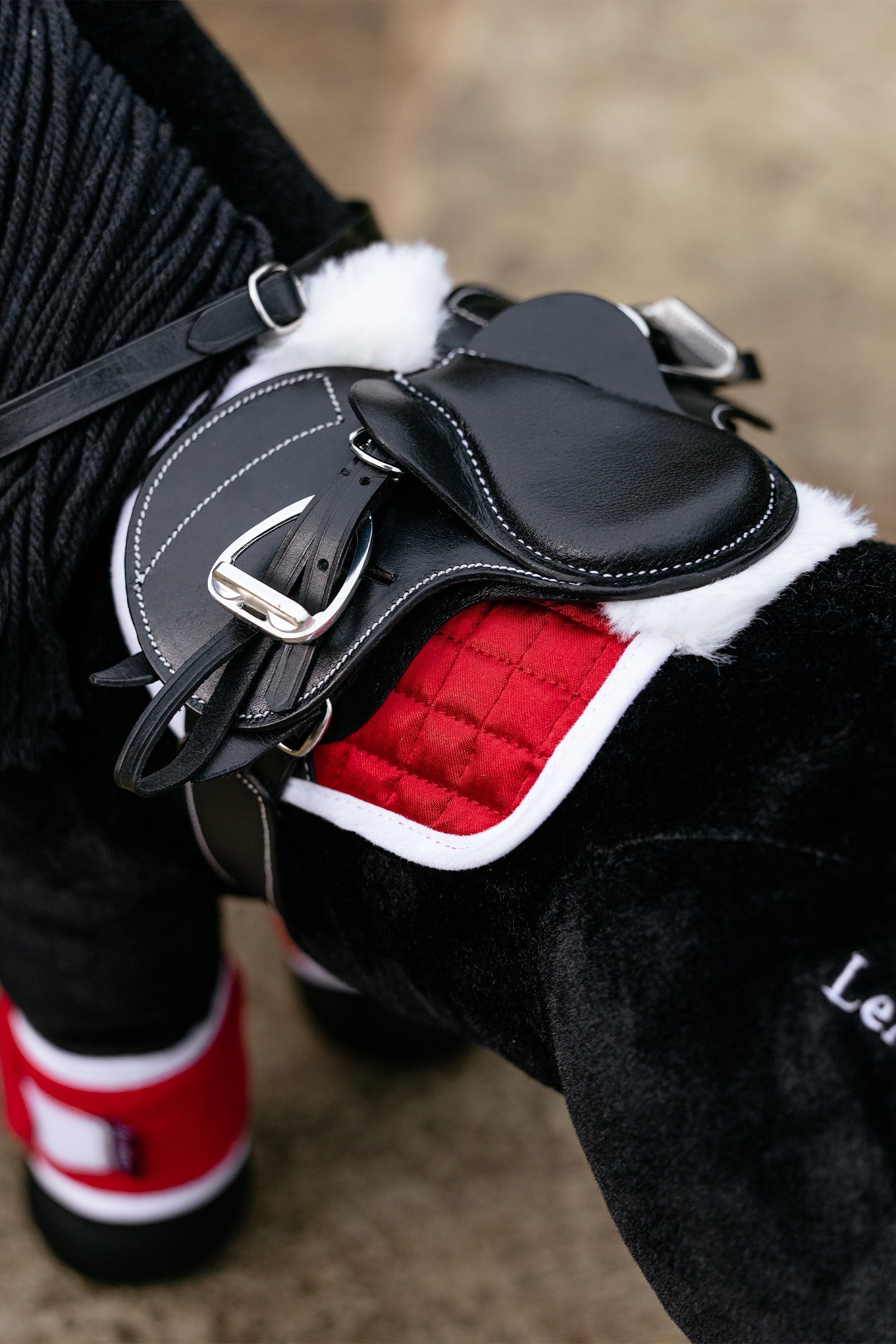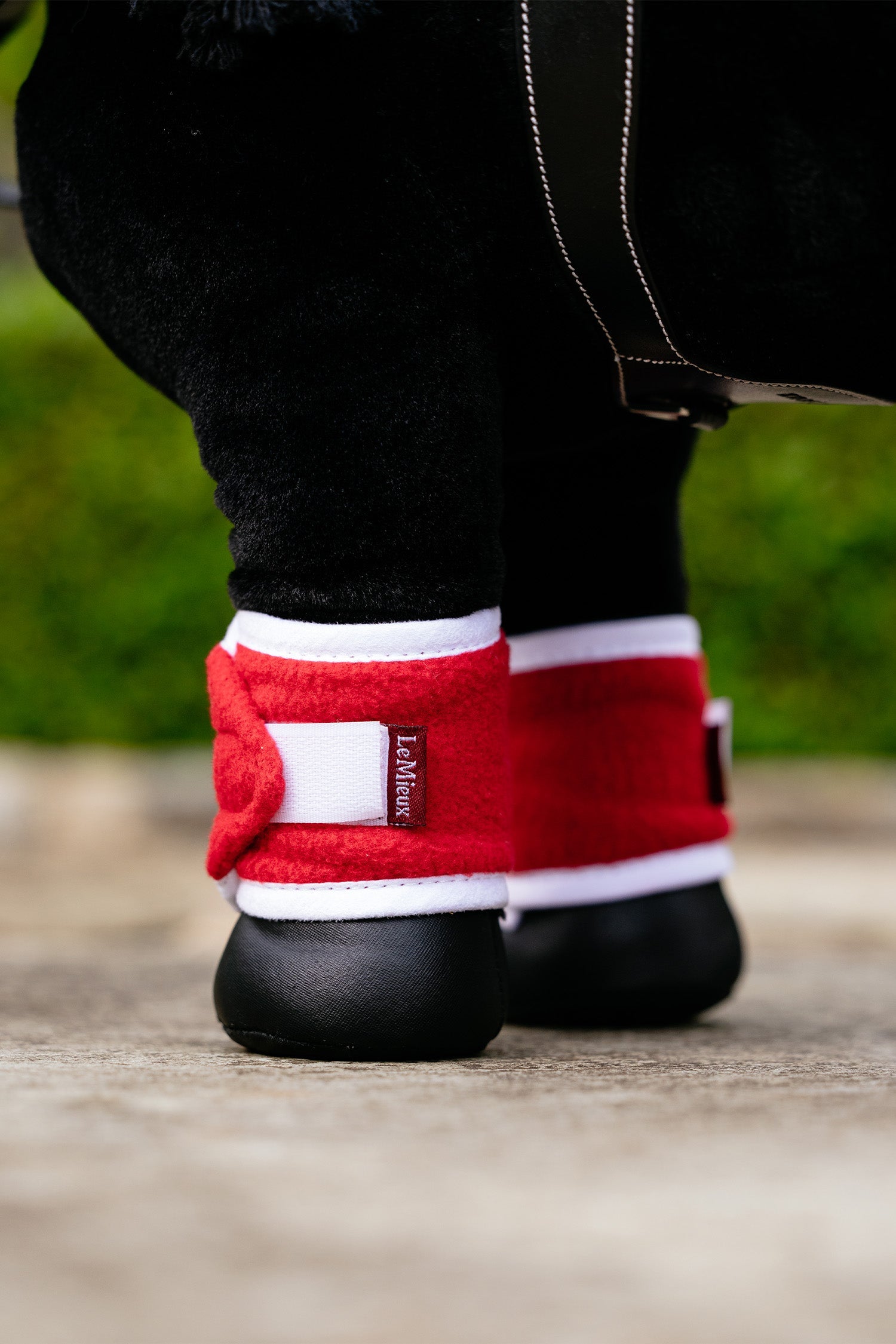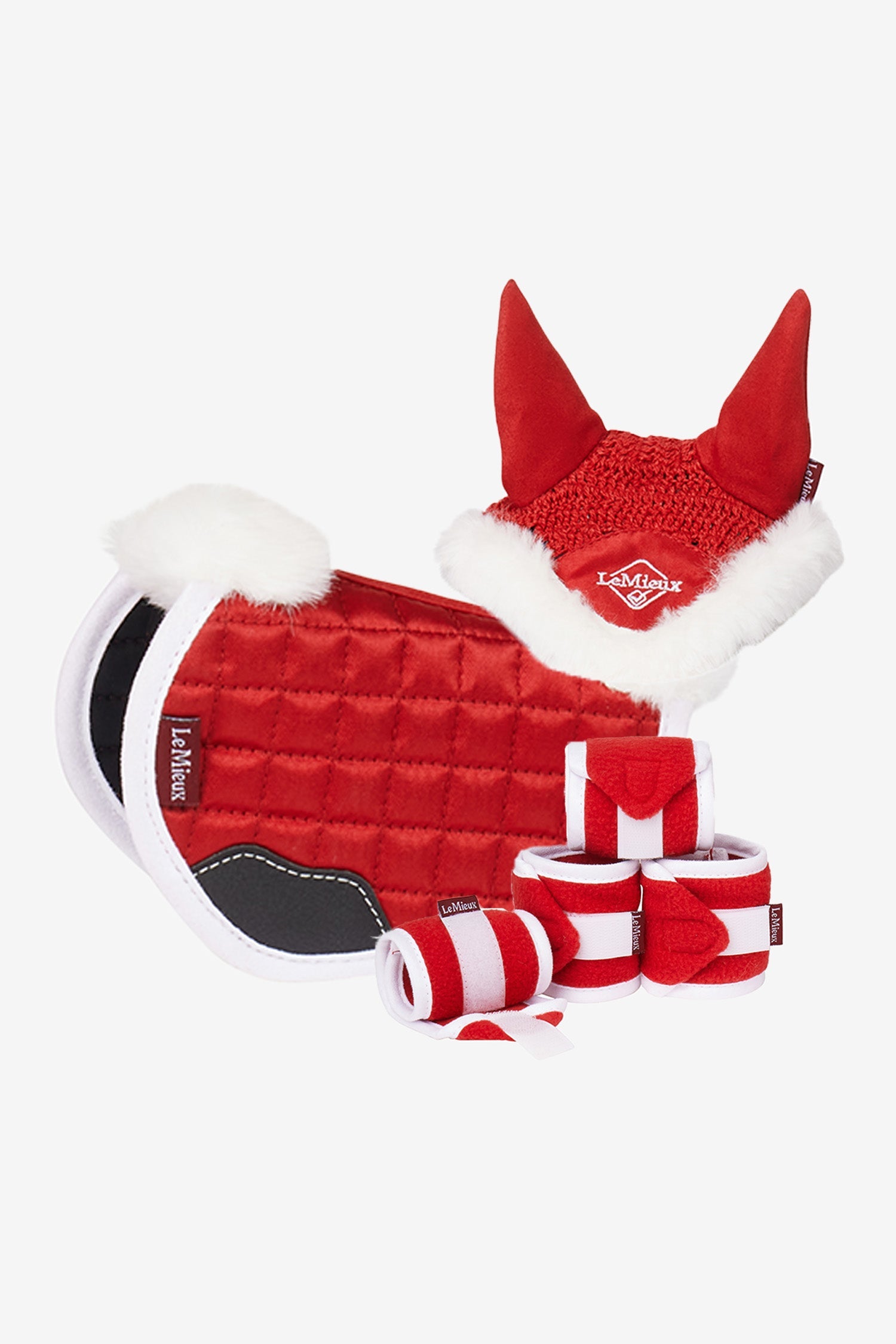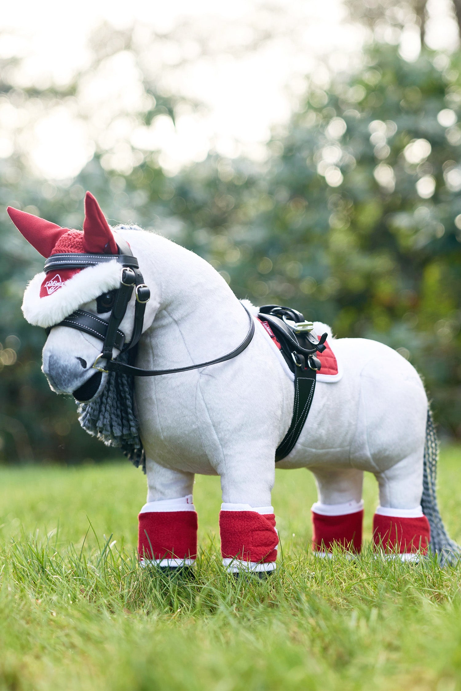 Sættet er komplet og indeholder fire rød-hvide bandager til benene, en juleinspireret rød-hvid hue samt en matchende rød-hvid sadelpad til legetøjsponyens sadel. Sammen skaber de et ensartet og stemningsfuldt look, der gør din legetøjspony til julens selvskrevne stjerne.