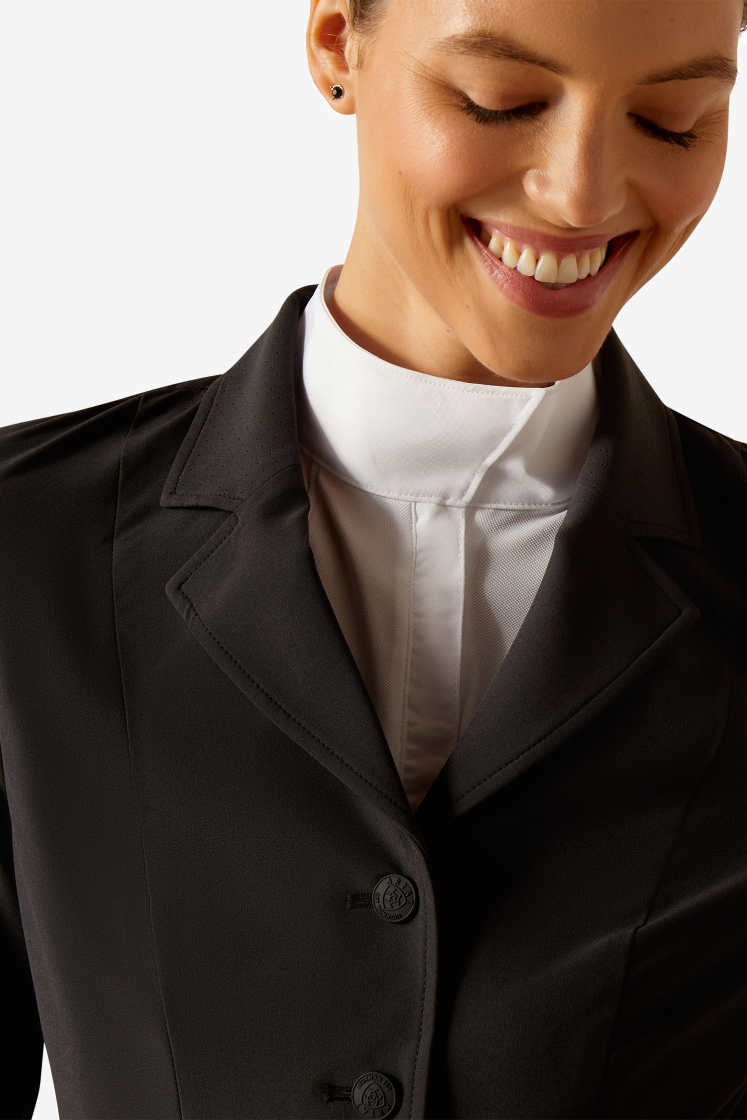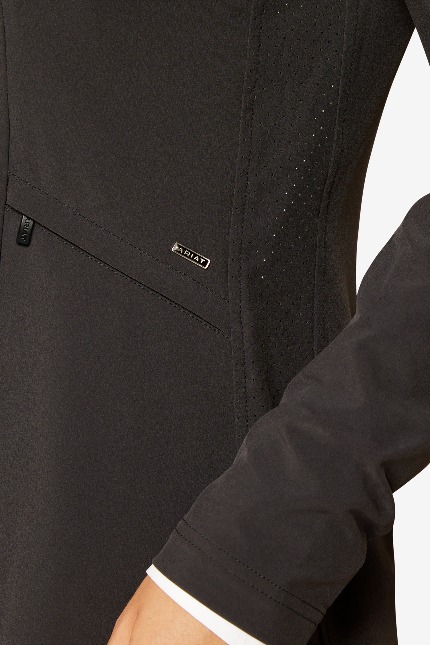Kavajen er designet til spring og terræn, men fungerer lige så godt i andre discipliner, hvor bevægelsesfrihed og komfort er afgørende. Det tekniske stretchmateriale giver fleksibilitet i hver bevægelse, mens den uforede konstruktion maksimerer ventilation og åndbarhed. Den skjulte lynlås foran sammen med knaplukning giver en glat silhuet og sikker pasform uden åbninger.
