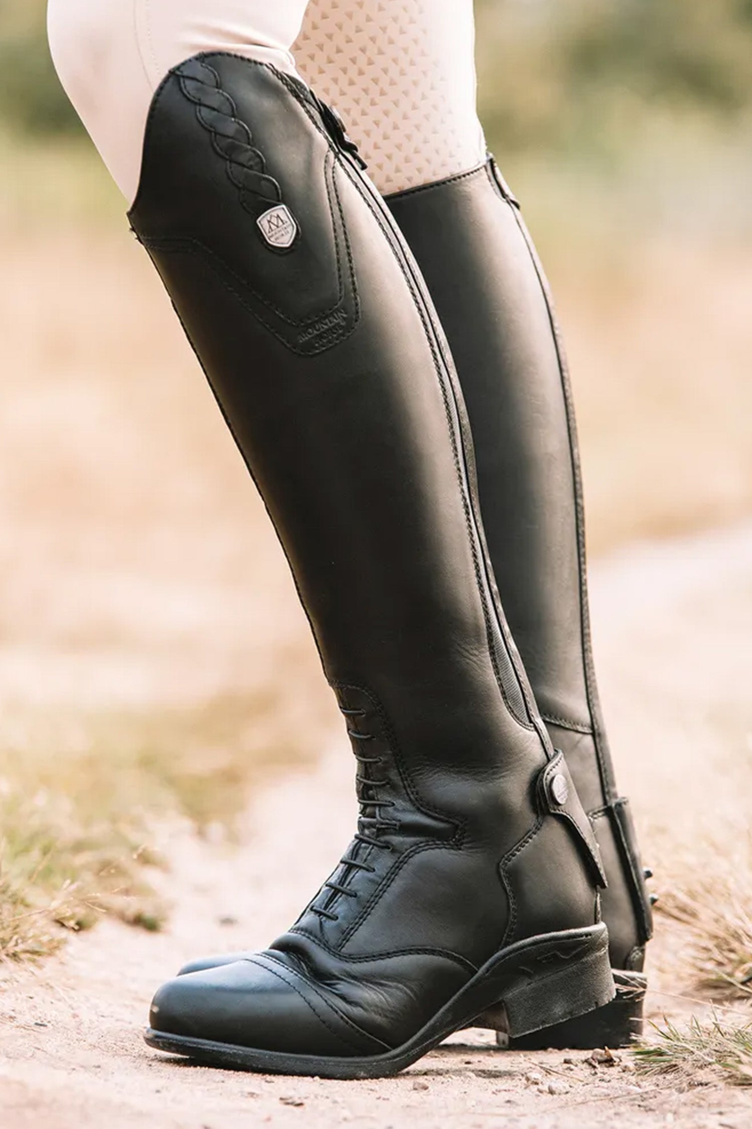 Mountain Horse Valkyria ridestøvler kombinerer klassisk elegance med moderne funktionalitet for ryttere, der søger både komfort, holdbarhed og et eksklusivt udtryk i stalden og på konkurrencebanen. Støvlerne er fremstillet i omhyggeligt udvalgt premiumlæder, som giver en blød og smidig fornemmelse omkring benet, samtidig med at materialet naturligt former sig efter rytterens pasform. Resultatet er en høj ridestøvle, der både føles behagelig og giver et stilrent, professionelt indtryk.