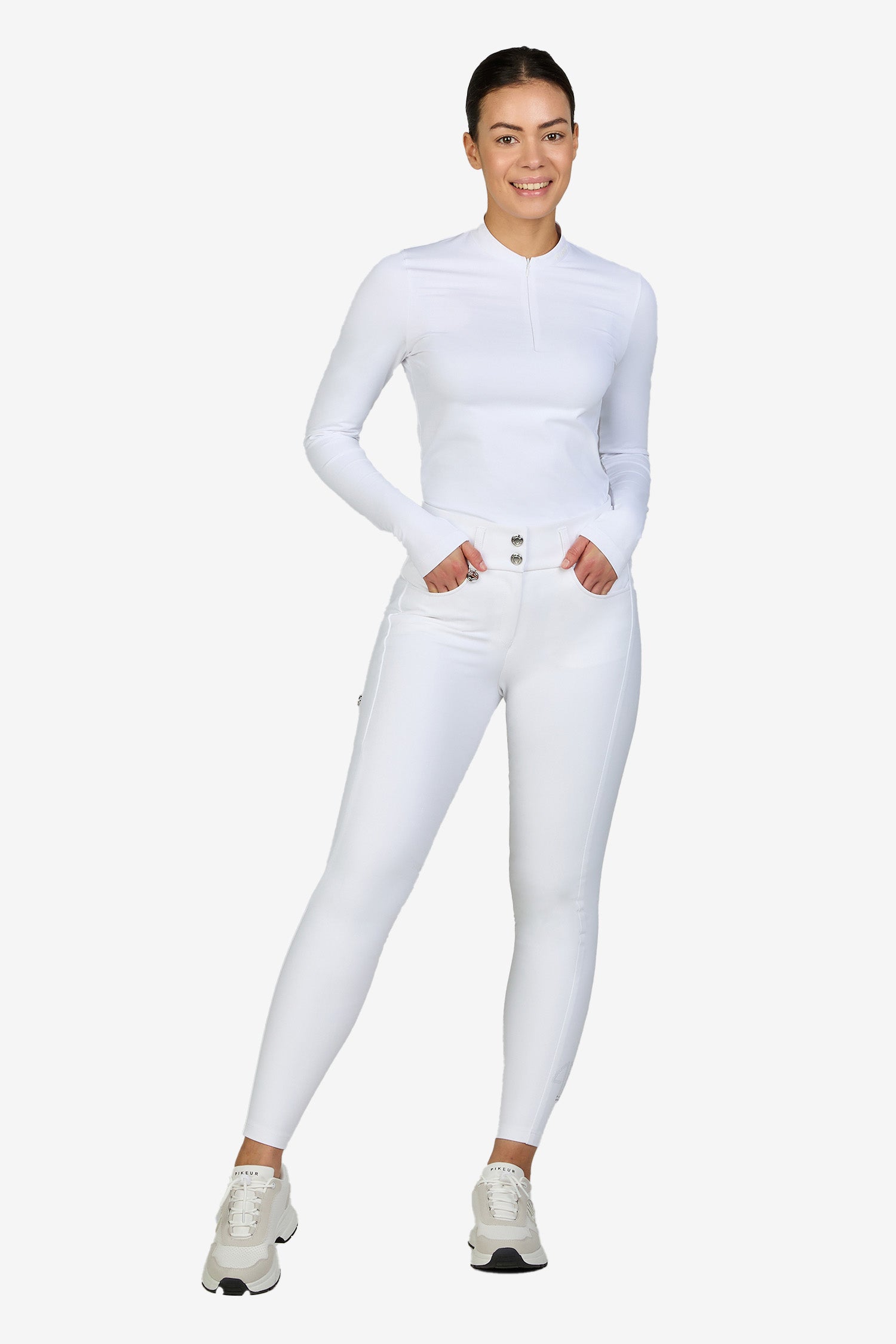 Bukserne har stilrene screen print-paneler i Pikeur Athleisure-design og en bred linning i yderstoffet, der giver en sikker og stabil pasform. Linningen lukkes med to knapper for øget komfort og støtte.