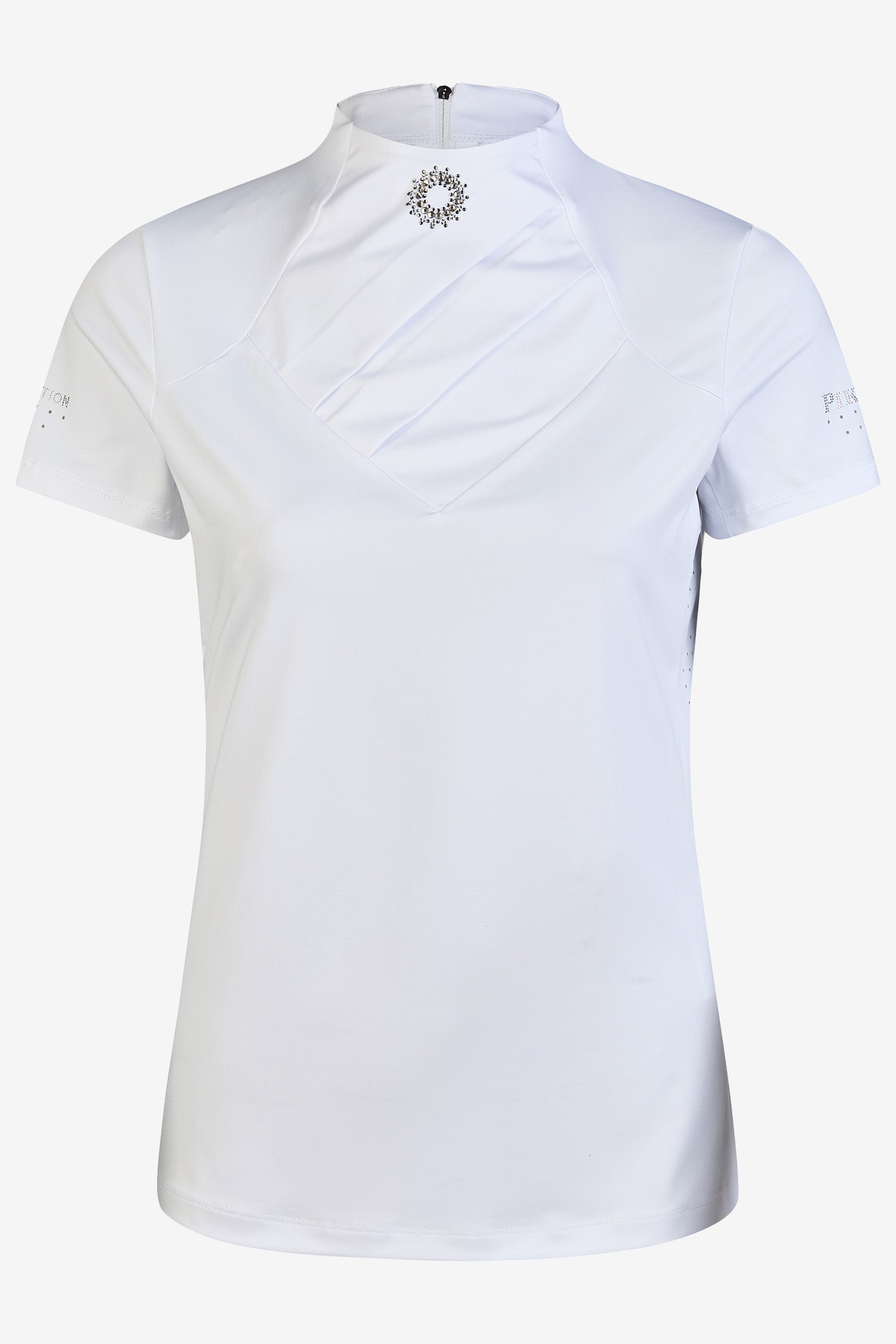 Kraven og fronten er lukkede og plisserede for et klassisk konkurrenceudtryk, med en centreret strassdetalje, der giver en eksklusiv og diskret glans. Lynlås bagpå gør det nemt at tage toppen af og på uden at forstyrre designet. Diskrete laserskårne detaljer på ærmer og ryg bidrager til øget ventilation og et moderne udtryk, mens strassen på ærmet forstærker den elegante helhed. Toppen er desuden udstyret med Livinguard AO-teknologi, som neutraliserer uønsket lugt på molekylært niveau og bidrager til en frisk fornemmelse hele dagen.
