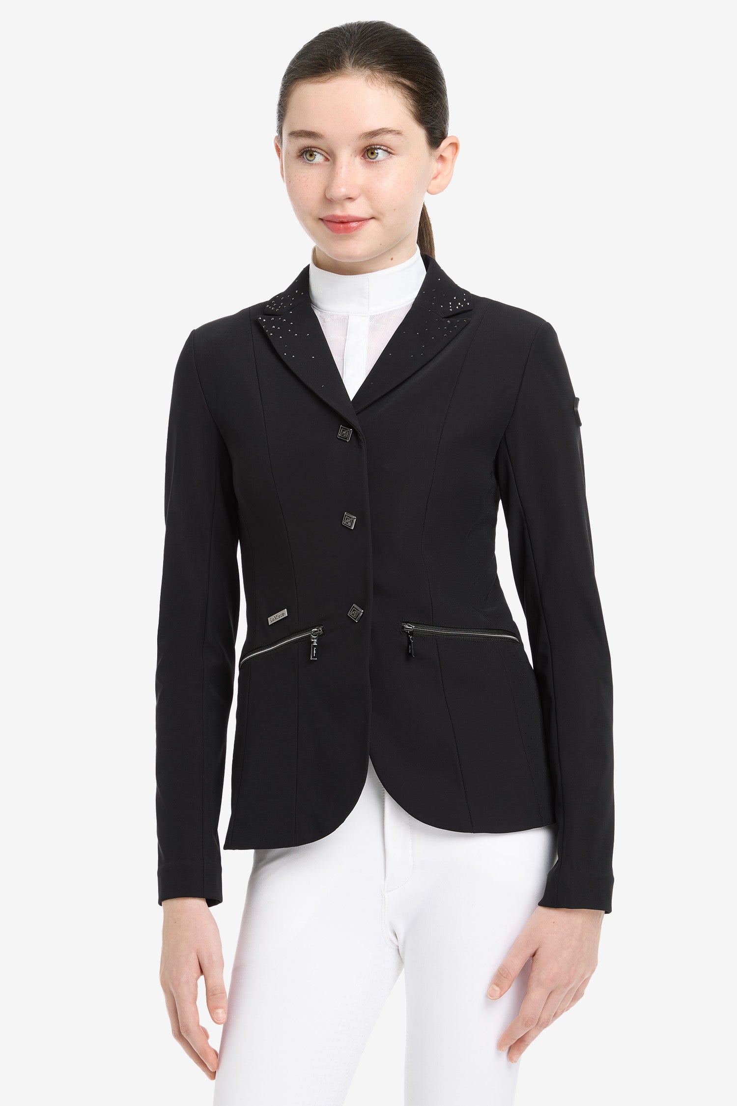 Diskrete crystaldetaljer på krave, bageste taljerem og slidser bagpå giver et sofistikeret look i ringen, mens stilrene LeMieux-detaljer ved hofte og ærme giver en gennemtænkt finish.