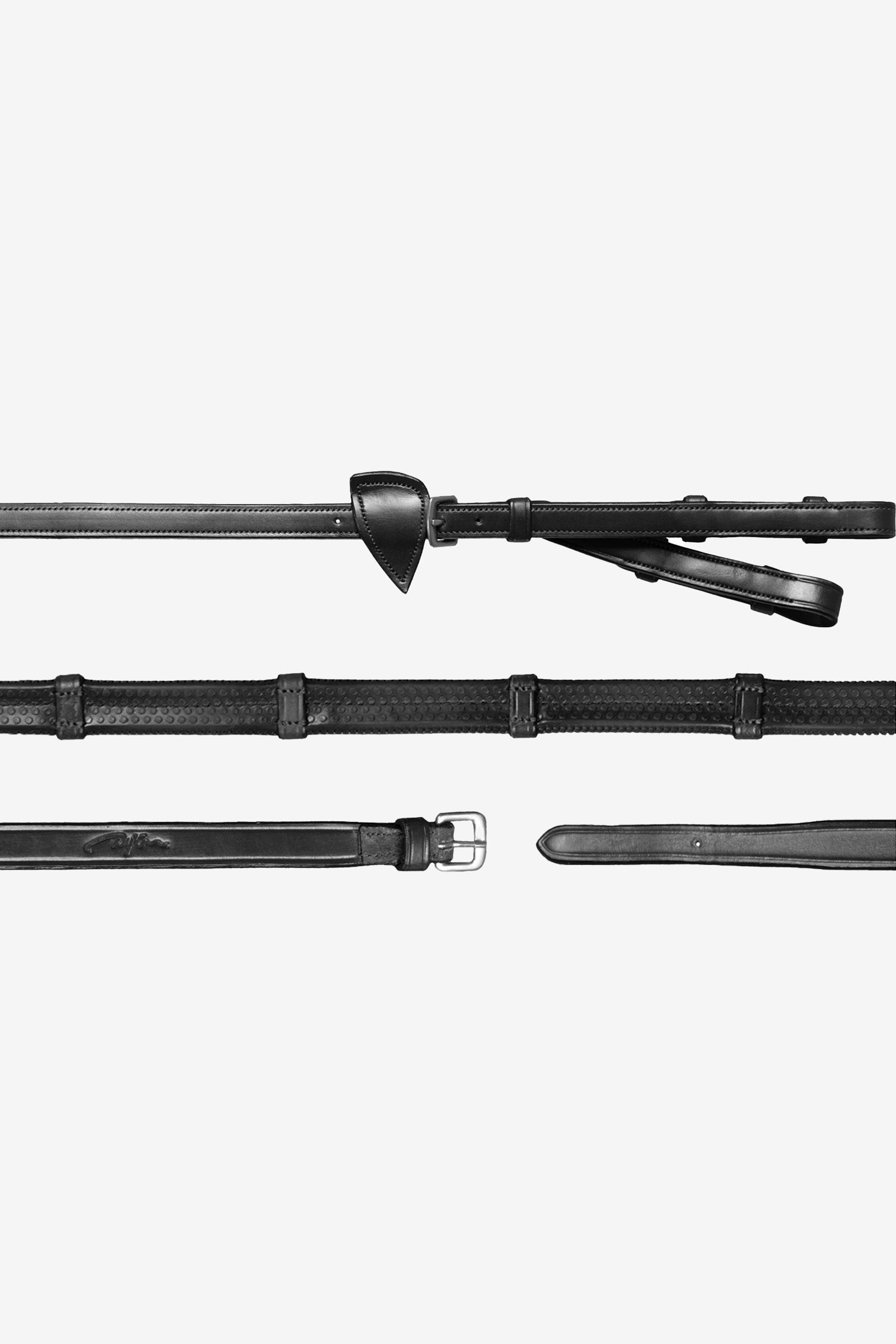 Tøjlerne er fremstillet i slidstærkt gummi med en ekstra blød fornemmelse for optimal komfort i hånden. De syv jævnt placerede læderstop giver et sikkert greb og hjælper dig med at holde en jævn tøjlelængde, selv i intense situationer. Takket være det smarte converter-design kan tøjlerne bruges til både trense og kandar, hvilket gør dem meget alsidige.