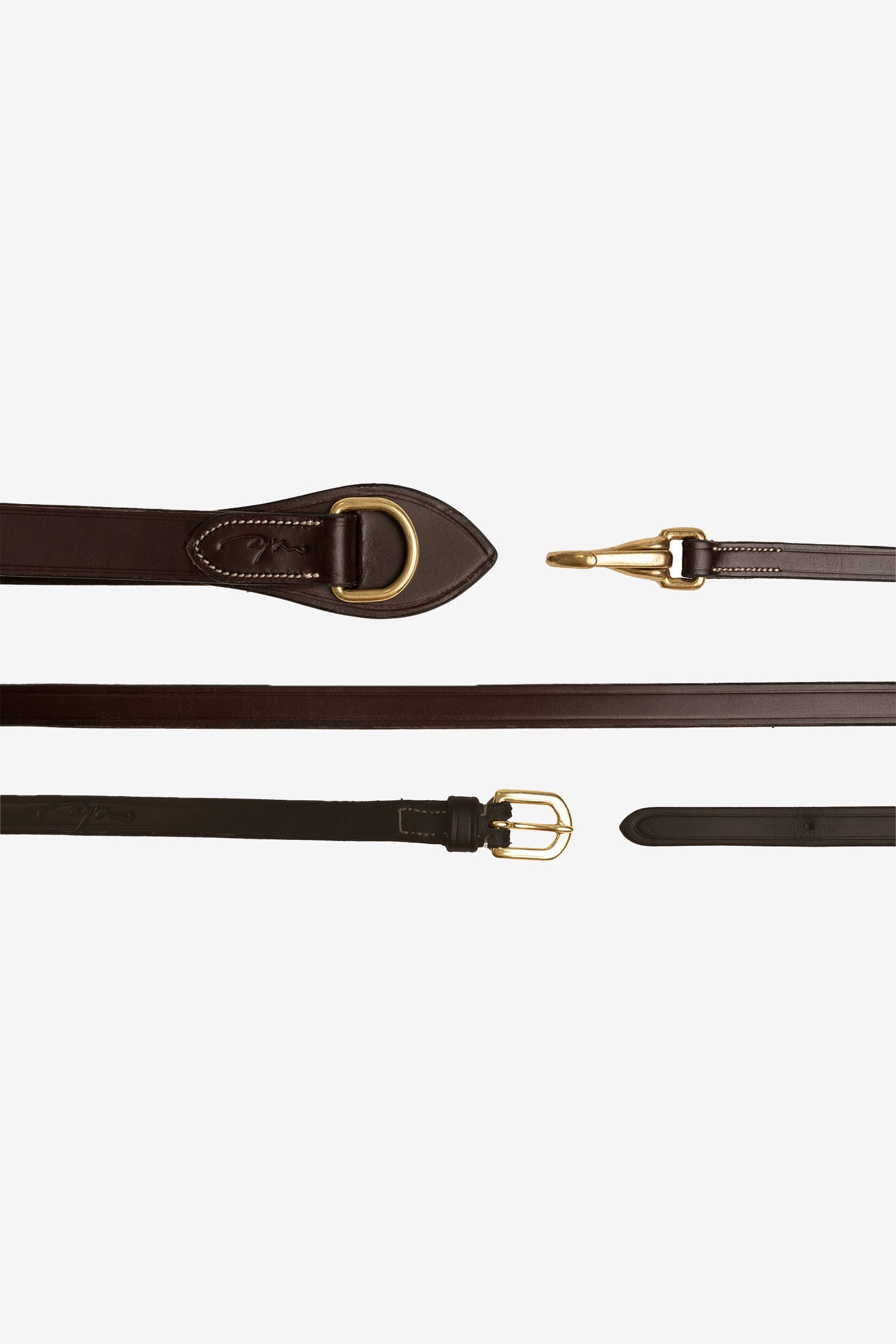 Med et 1/2” (13 mm) bredt lædergreb ligger tøjlerne behageligt i hånden og giver en stabil fornemmelse uden at føles klodsede. De er udstyret med to karabinhager for nem og hurtig fastgørelse og leveres med et aftageligt beslag, hvilket gør dem ekstra alsidige til daglig træning.