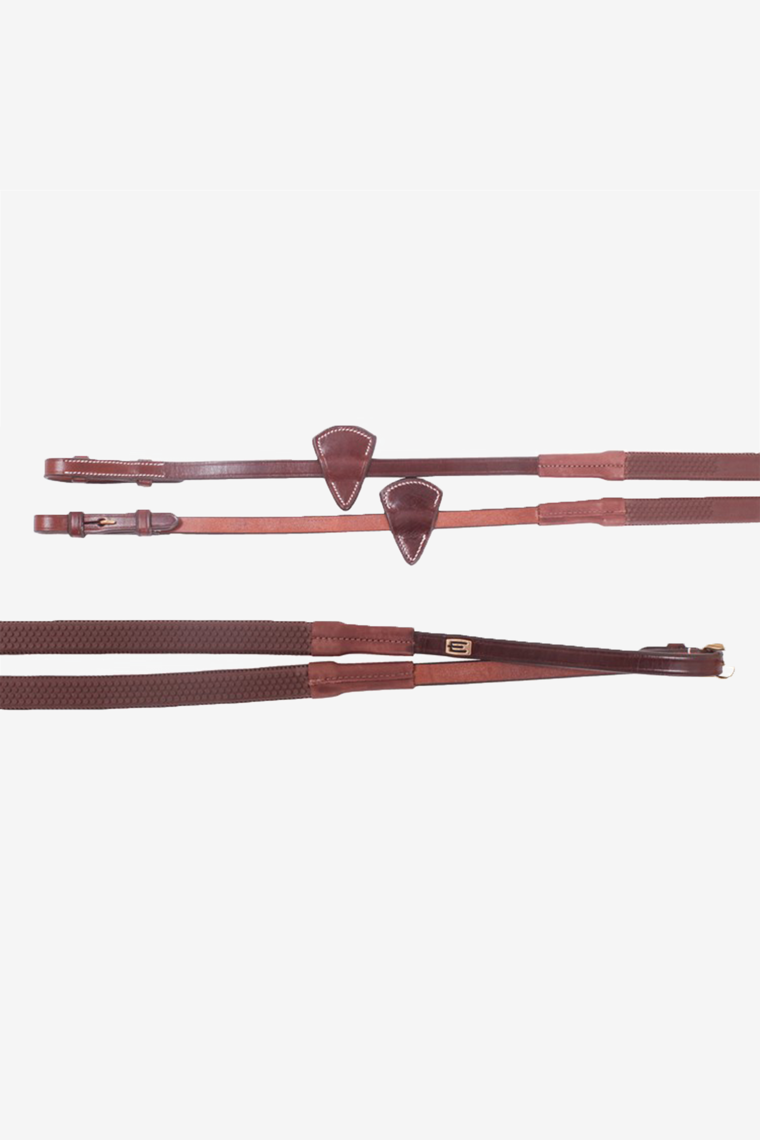 Gummitøjler med eksklusivt italiensk læder og hvide syninger. Martingalstop med hvid søm og spænder i messing.