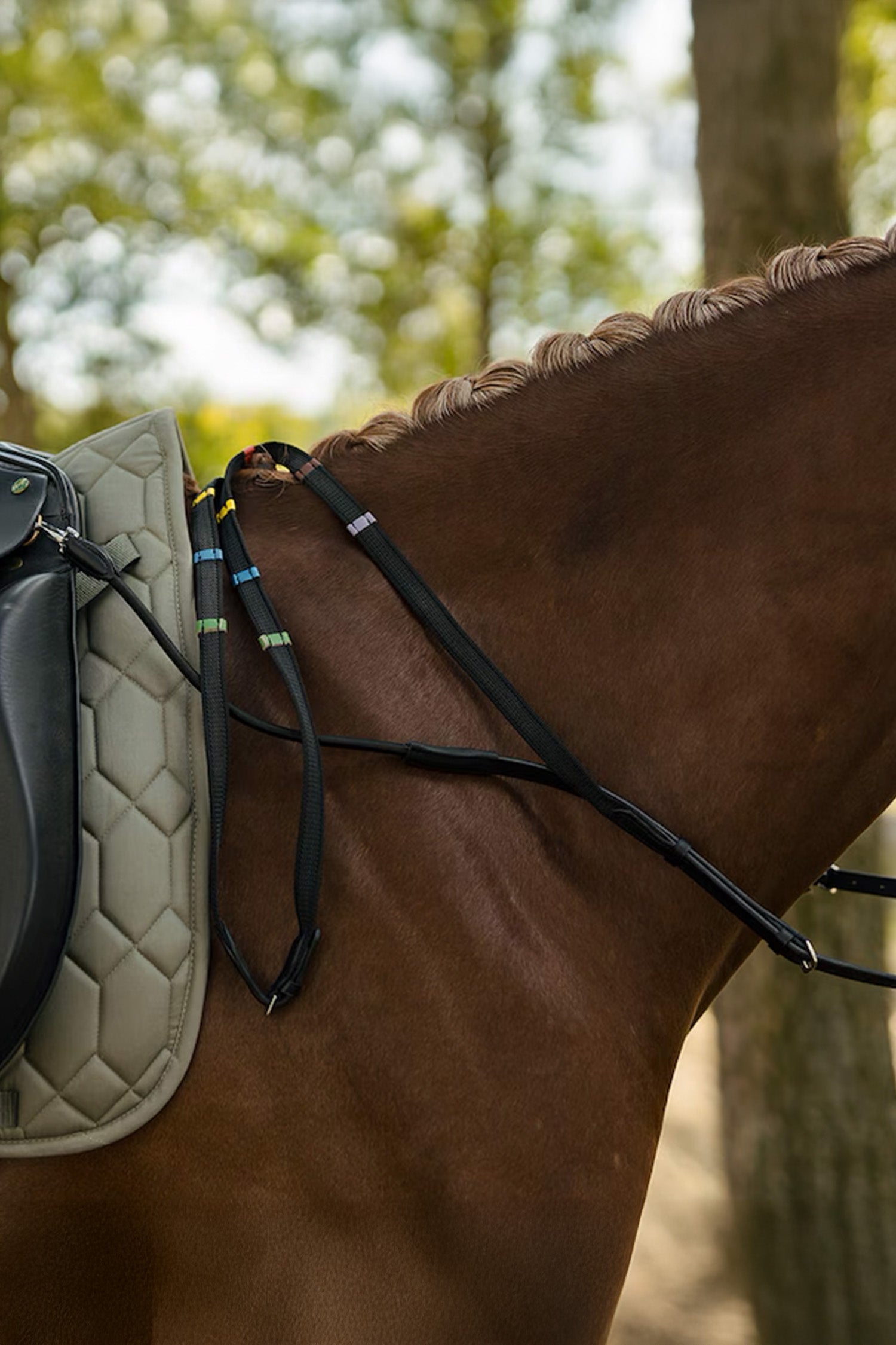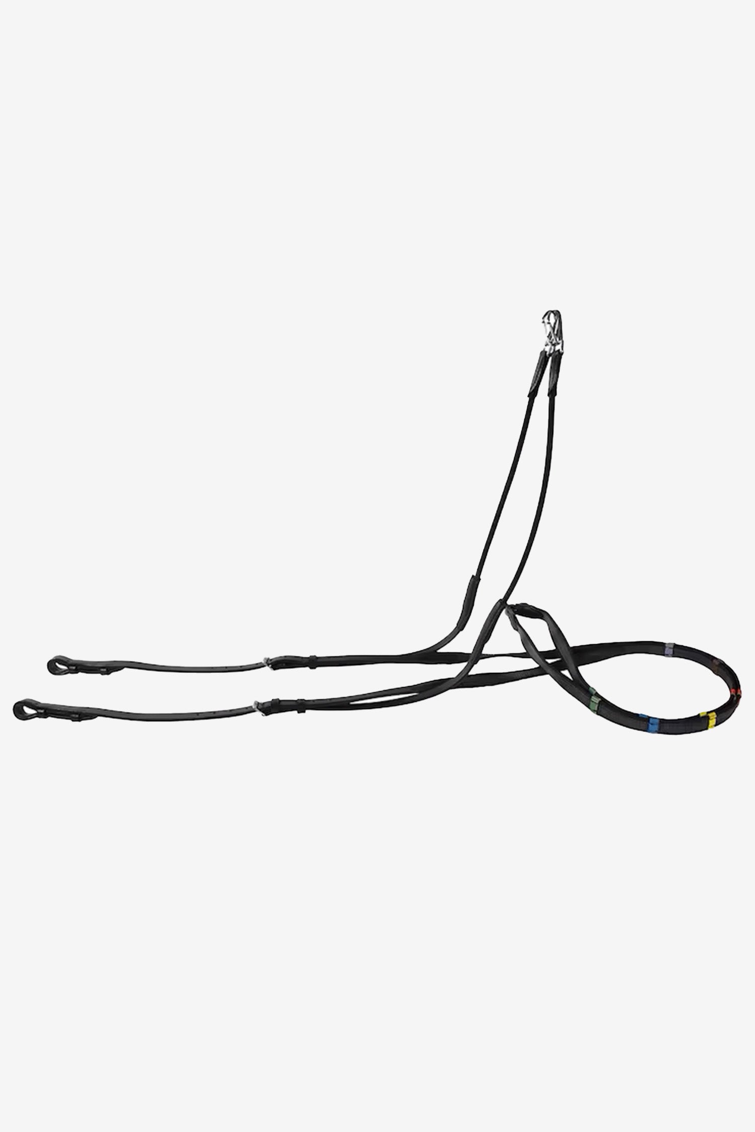 En funktionel og alsidig løsning, der kombinerer halsrem og fortøj i ét. Alle remme er fuldt justerbare og aftagelige, hvilket gør det nemt at tilpasse udstyret til både hest og rytter.