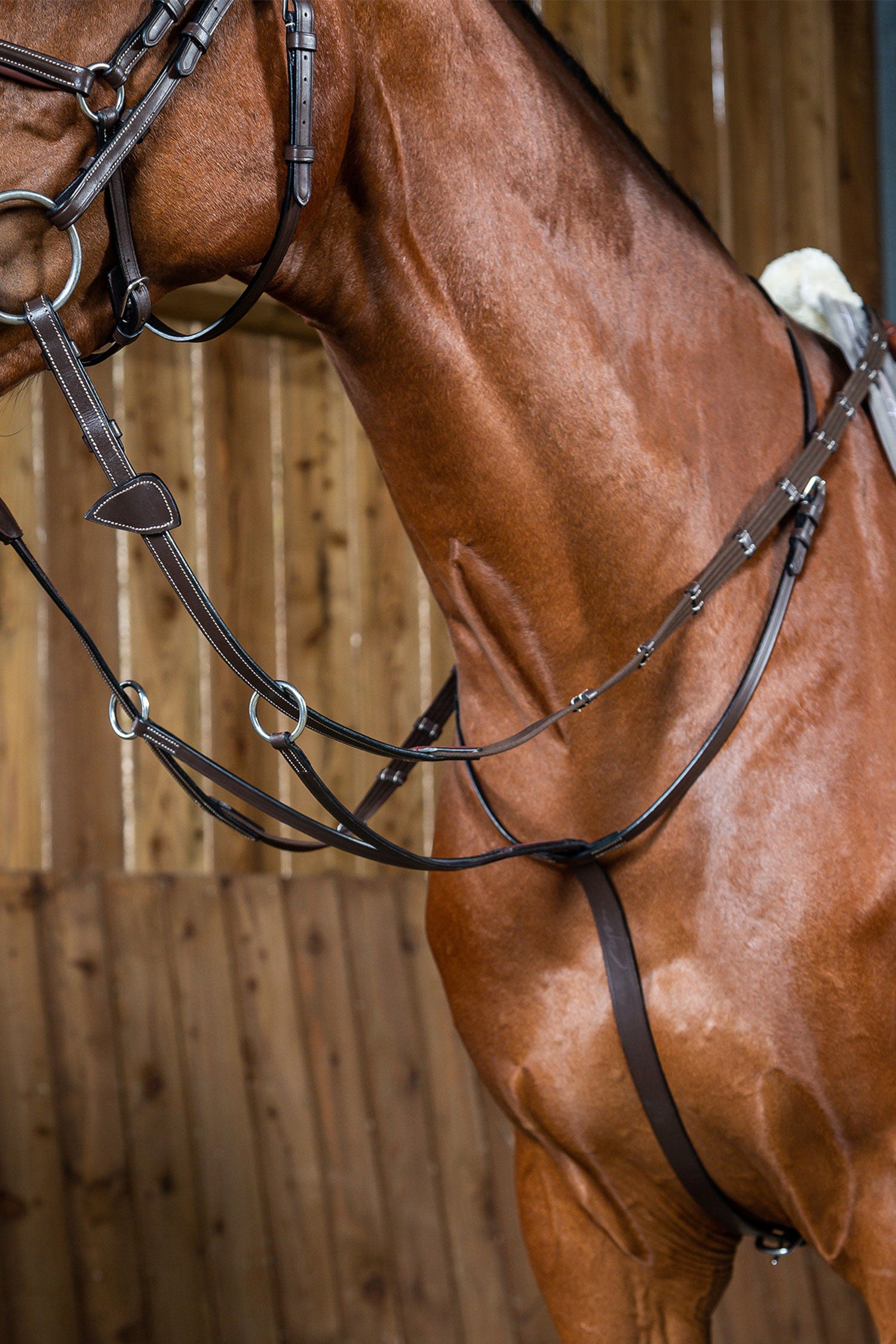 Dy'on Running Martingal fra Working Collection er fremstillet i slidstærkt flat bøffellæder og er udsmykket med dekorative syninger for et stilrent og klassisk look. Den er designet til at give stabilitet og kontrol ved at forhindre, at hesten hæver hovedet for meget, samtidig med at den lader hesten bevare sin naturlige bevægelsesfrihed.