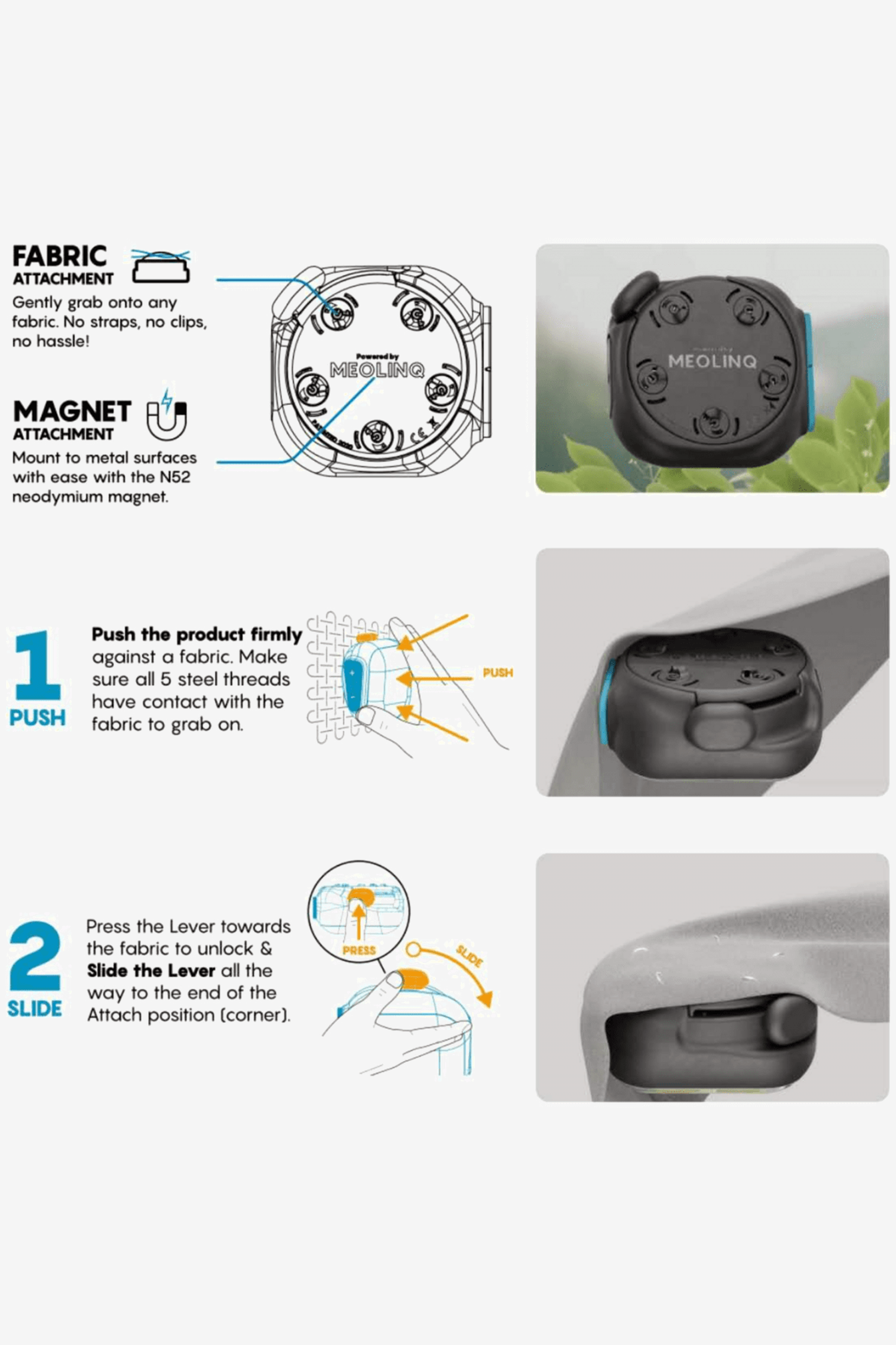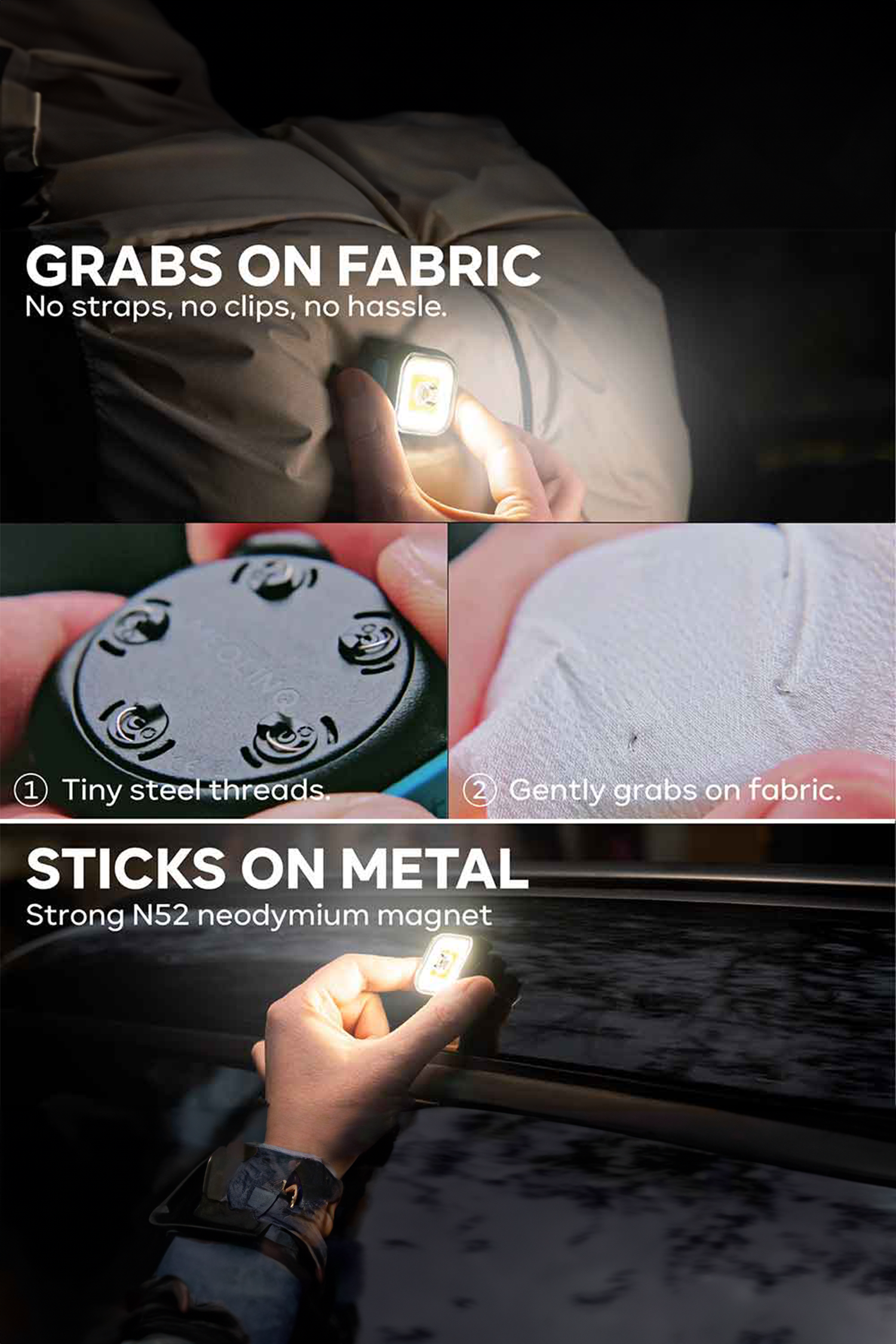 Lampen er udstyret med et patenteret ståltrådsmonteringssystem – en svensk opfindelse fra MEOLINQ – som gør det muligt hurtigt og sikkert at fastgøre lampen på alle typer tekstiler uden stropper, skader eller mærker. Derudover kan den fastgøres på magnetisk metal for endnu flere anvendelsesmuligheder.
