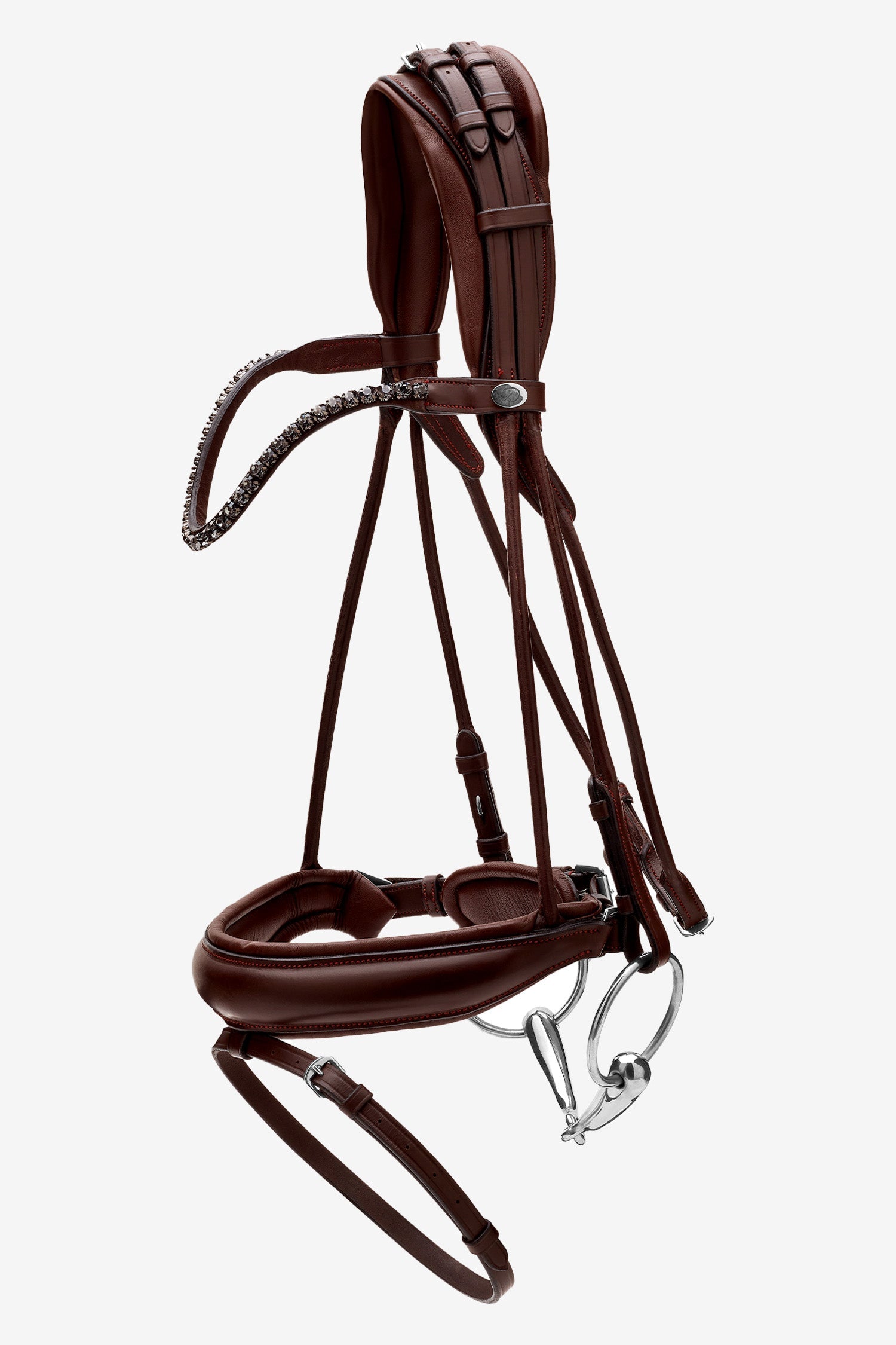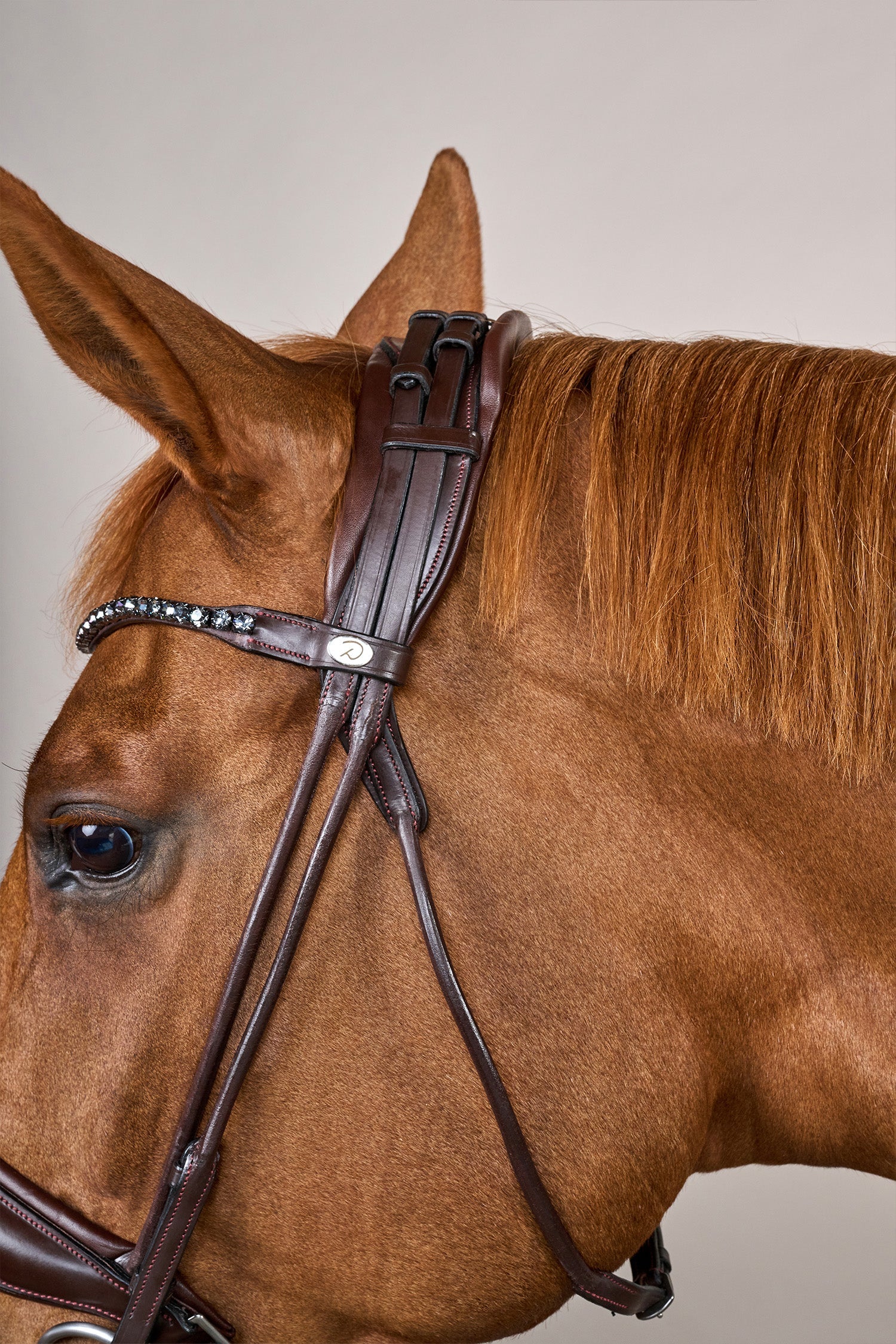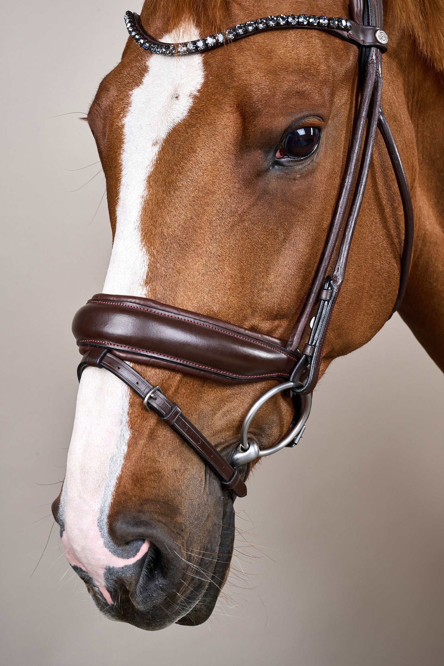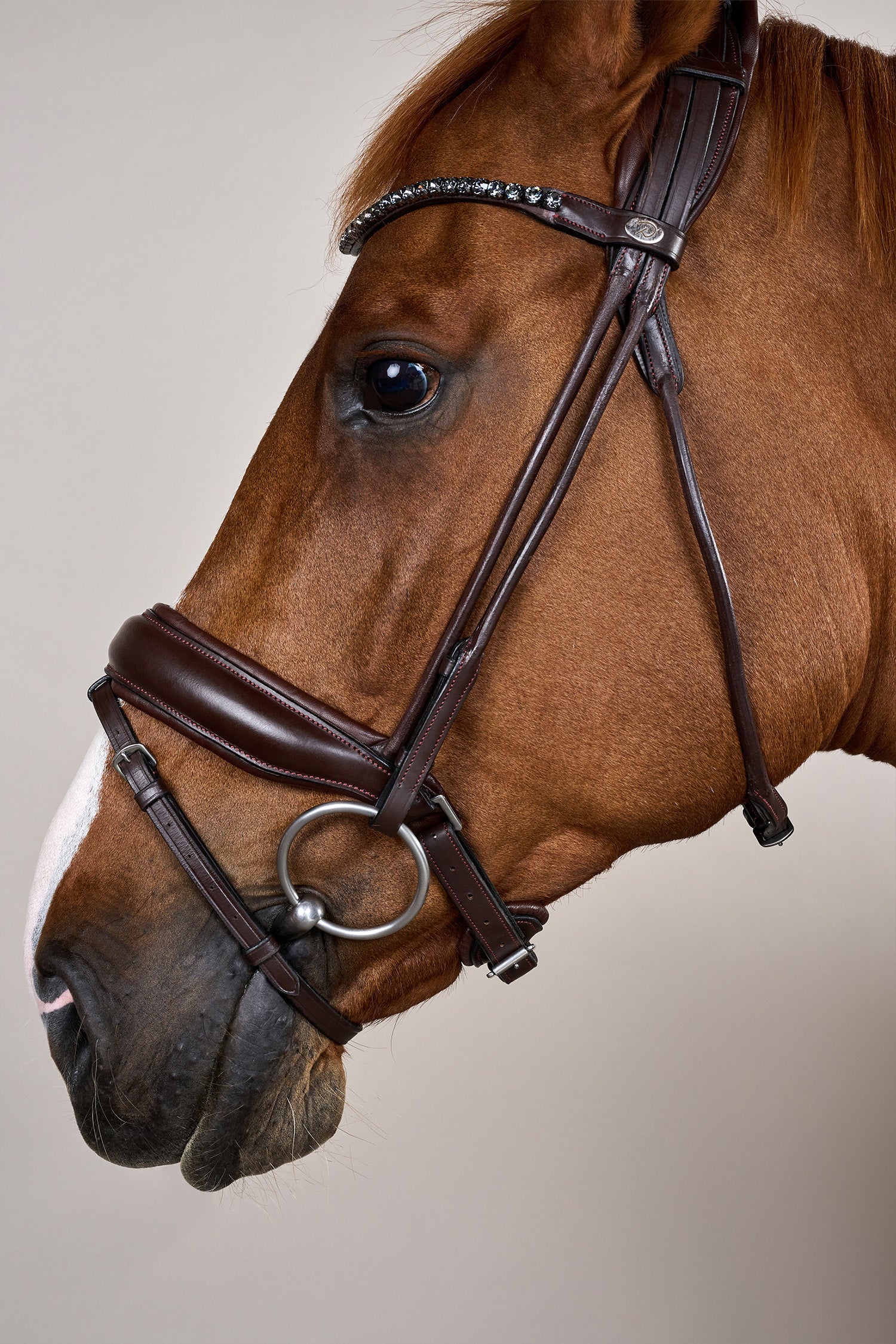 Trensen har en bred, blødt polstret næserem, der giver jævn trykfordeling og stabilitet uden at forårsage ubehag. Det rundsyede læder giver et elegant og traditionelt dressurlook, mens det V-formede pandebånd med fine grå Swarovski-krystaller tilføjer en subtil, men luksuriøs detalje, der fremhæver hestens udtryk.