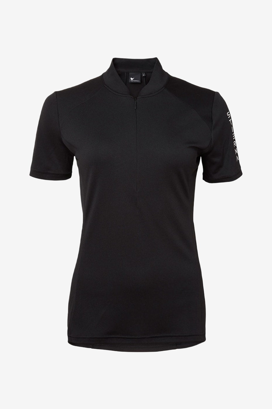 Stående krave med skjult lynlås. Den nederste del af trøjen har et asymmetrisk design for en bedre pasform ved ridning.