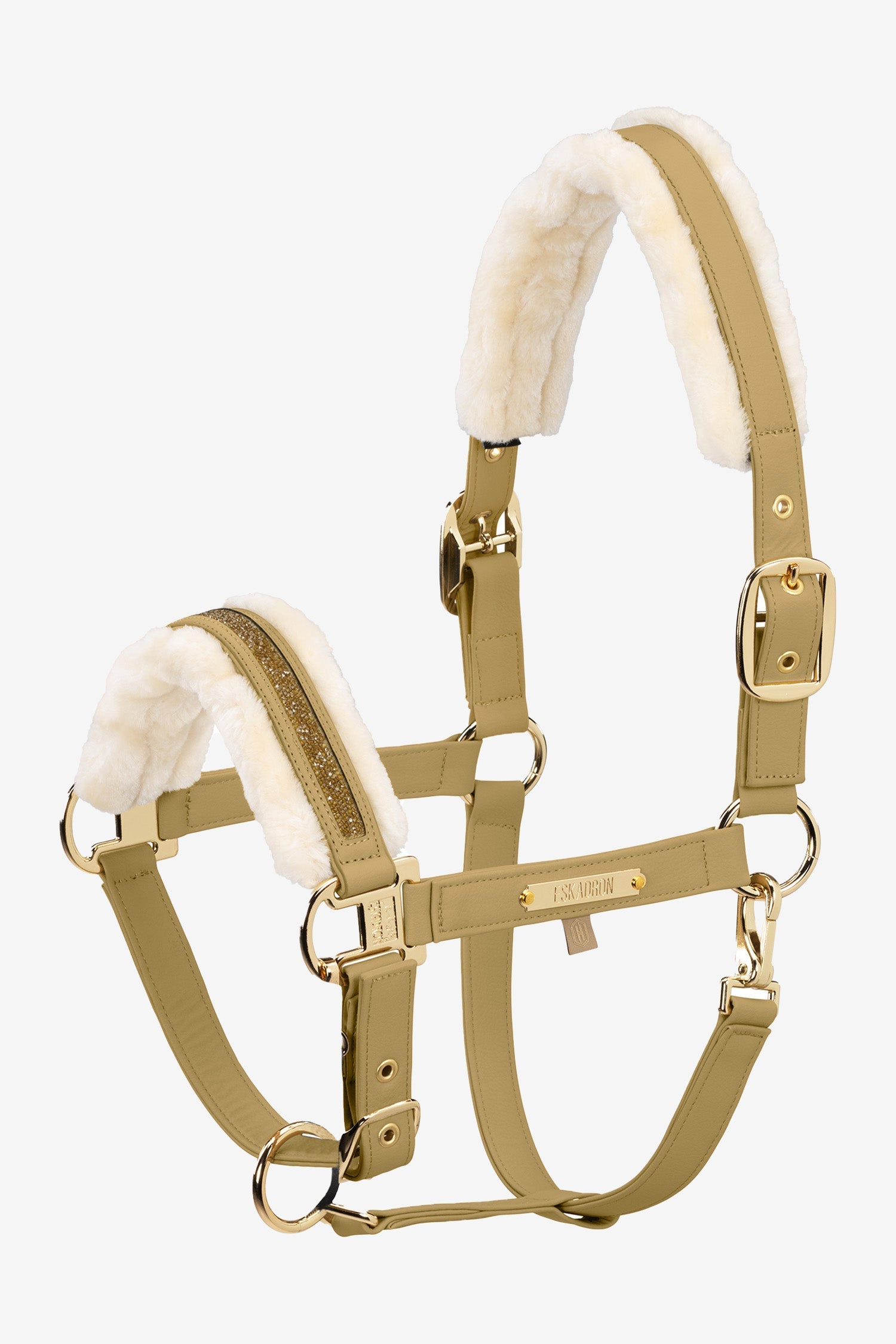 Ein exklusives Halfter von Eskadron aus elegantem Kunstleder mit funkelnden Steindetails am Nasenriemen. Das weiche Kunstfell an Nasen- und Genickstück sorgt für zusätzlichen Komfort und verringert das Risiko von Scheuerstellen – perfekt für Pferde mit empfindlicher Haut.