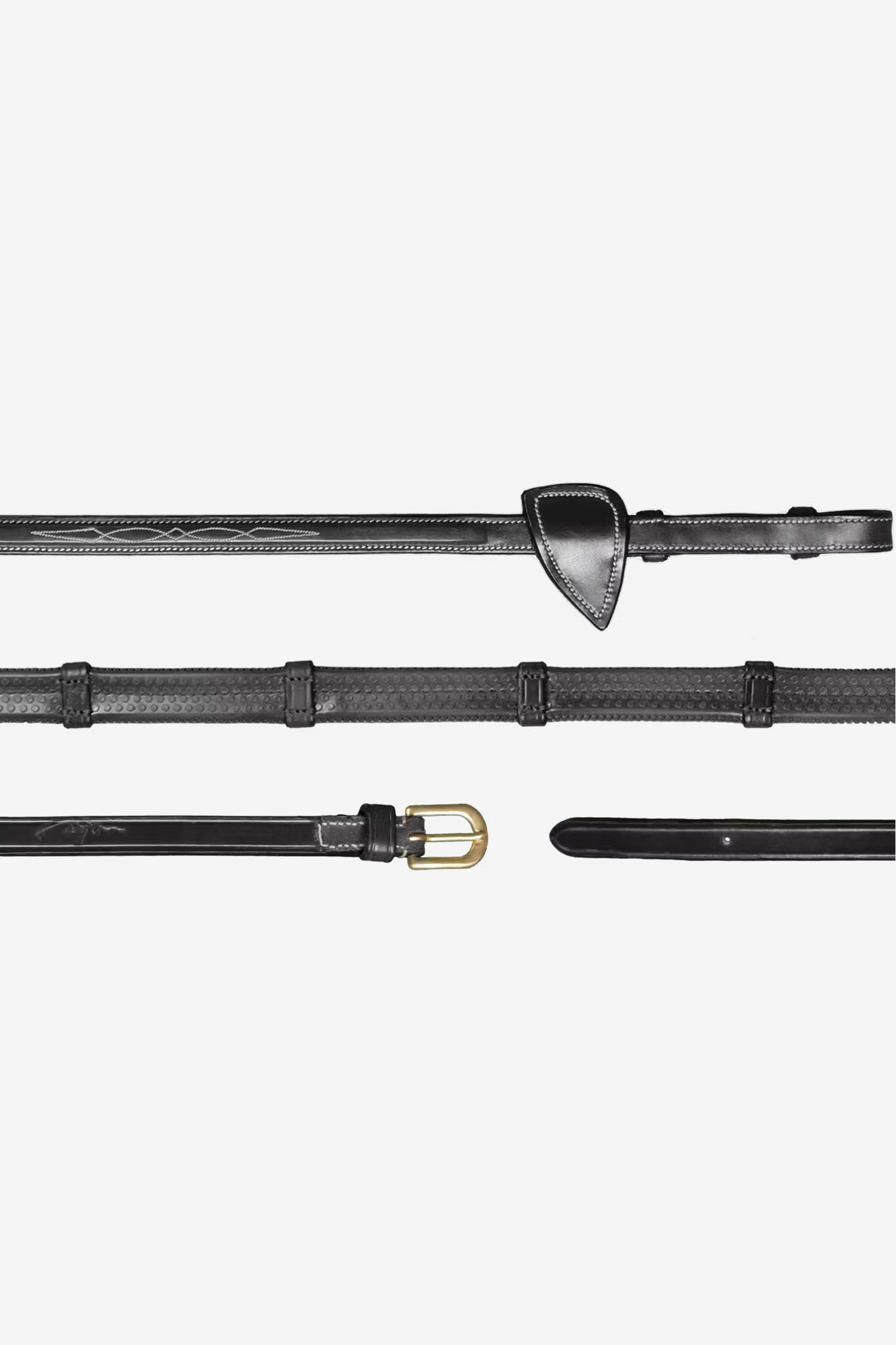 Erzielen Sie optimalen Halt und Präzision mit diesen Zügeln aus der exklusiven Dyón Collection. Sie kombinieren strapazierfähiges Gummi mit europäischem Premiumleder und bieten so Funktion und Eleganz.