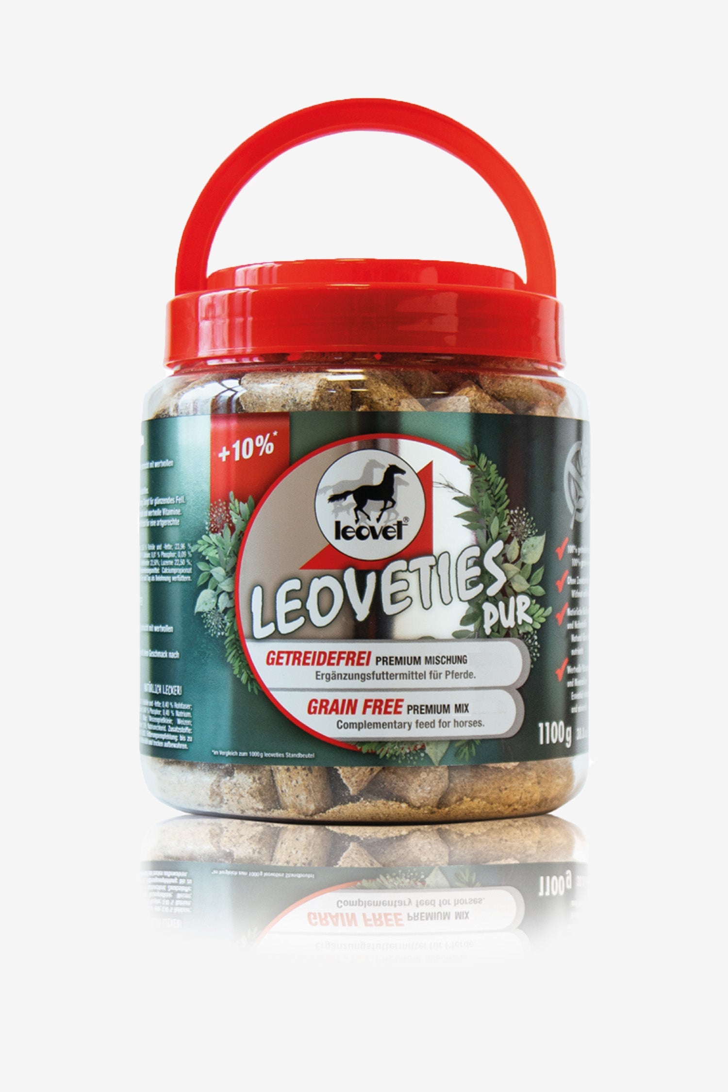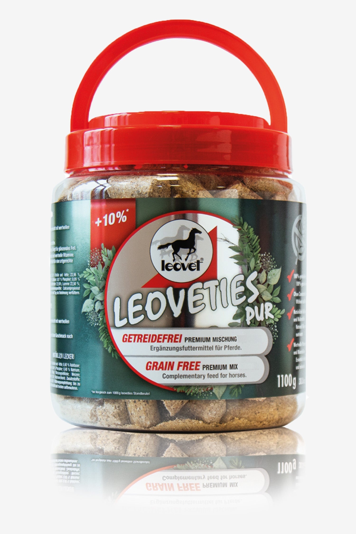 Thanks to the grain-free recipe, Leoveties are gentle on the stomach and also suitable for sensitive horses. The practical and reusable jar of 1100 g makes it easy to bring to the stable or competition.