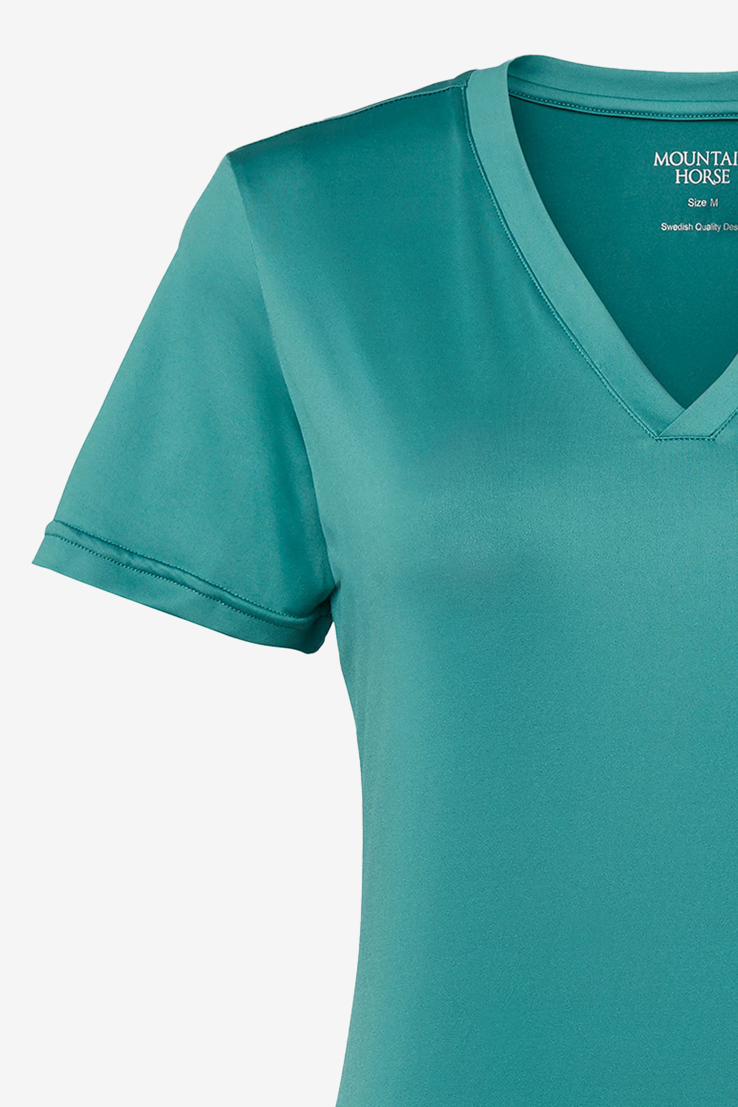 Functional tech top with a v-neck, made of a cooling material that effectively wicks away moisture.