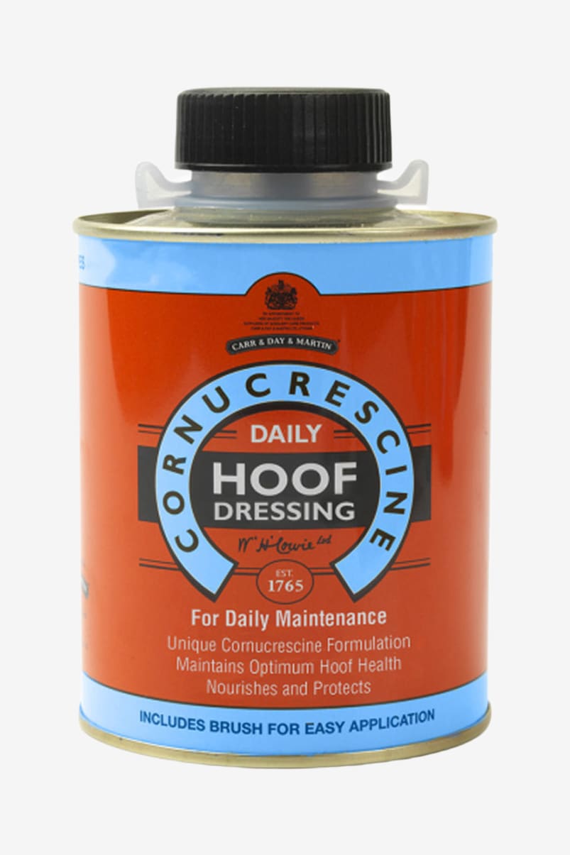 - Cornucrescine Daily Hoof Dressing is the absolute best you can use every day on the horse's hooves. Use the included brush in the lid for easy application.