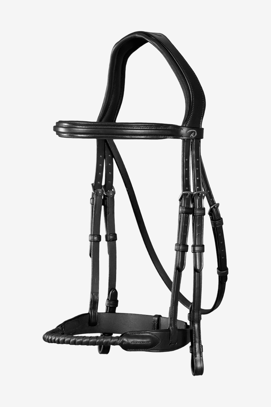 Anatomical bridle with leather-covered rope noseband. Dyón's new bridle combines comfort with style and is made from the finest leather. The headpiece is slightly wider with a cut-out for the ears and is padded with 2 mm neoprene.