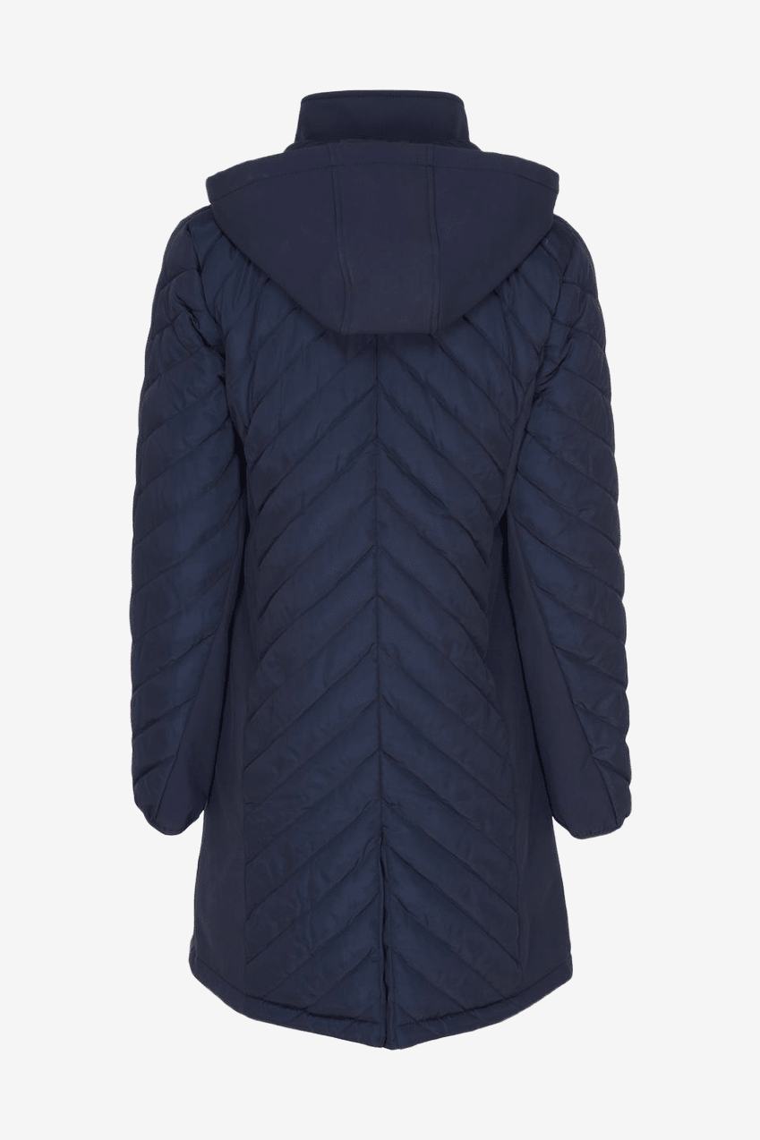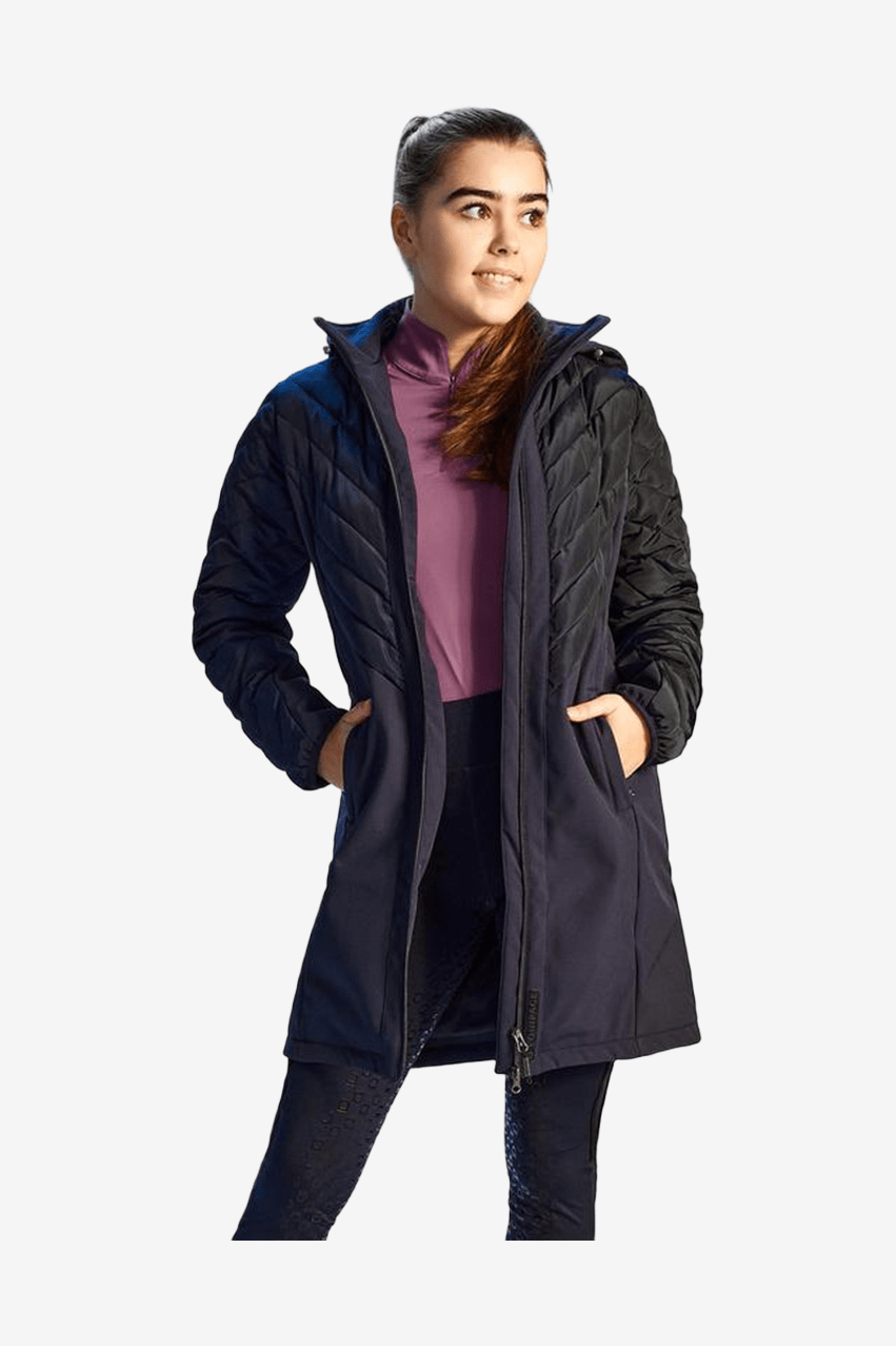 Coat in a hybrid design with a quilted upper section and sleeves, and a softshell lower section. The outer material is water-repellent and can withstand light drizzle. The hybrid material makes the coat lightweight and flexible, and it can easily be worn under a thicker coat when the cold sets in. Two-way zipper at the front and a removable hood that can also be adjusted with elastic straps.