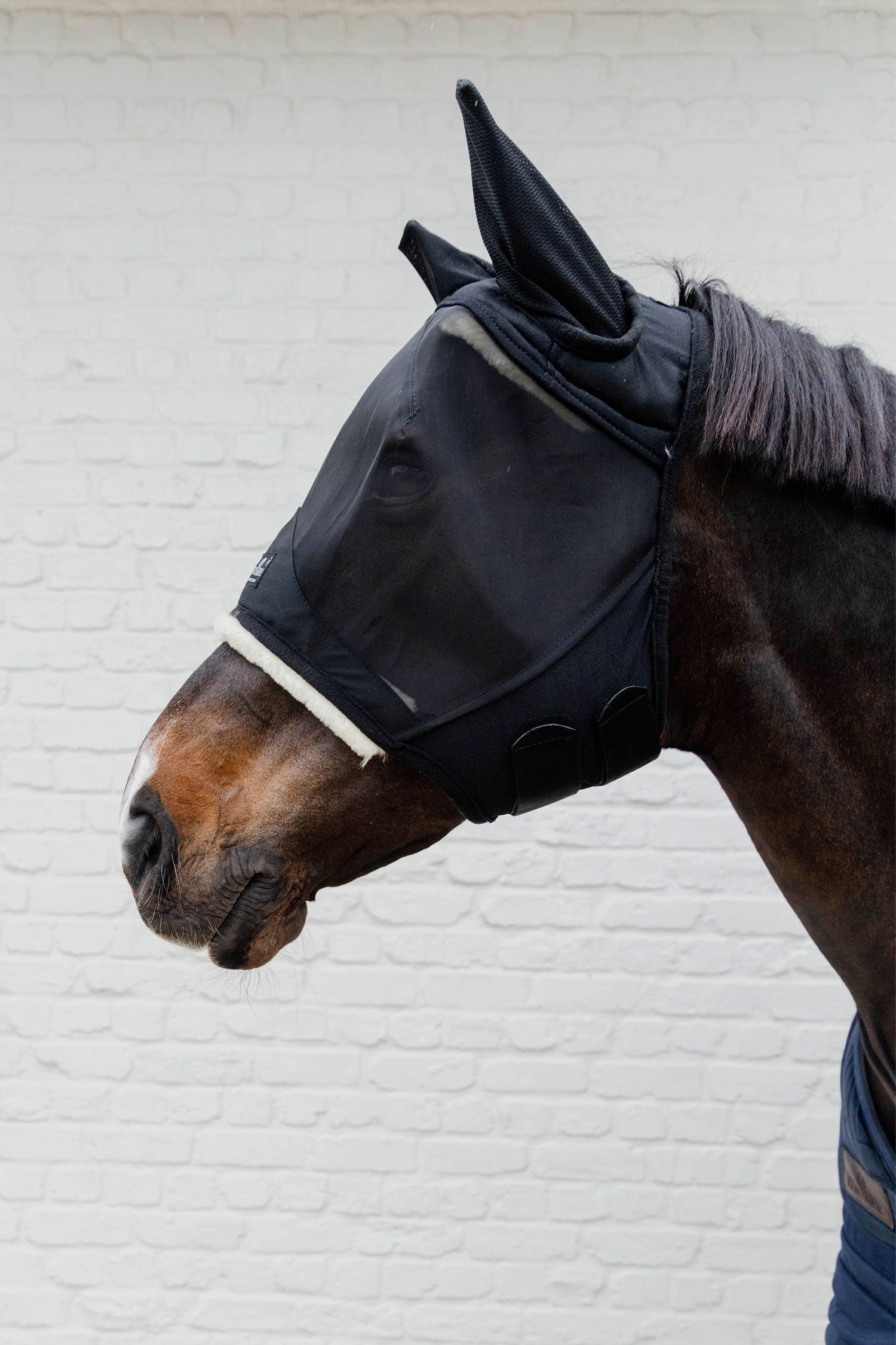 The fly hood closes with a double Velcro closure under the horse's jaw.