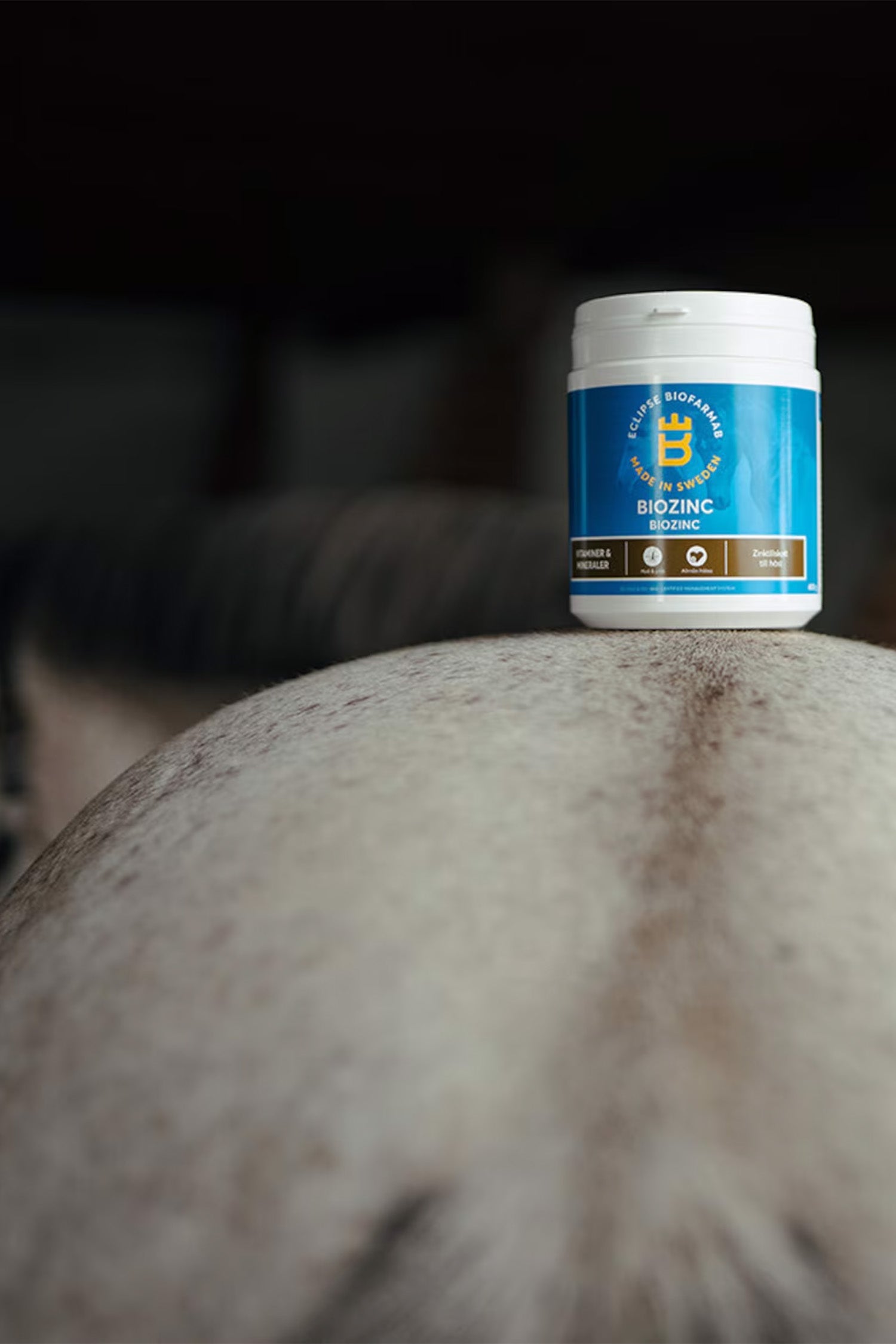 Used when the zinc content of the feed does not meet the horse's needs or in case of deficiency symptoms. Eclipse Biofarmab BioZinc is given to horses with confirmed or suspected zinc deficiency. The product also contains inulin* and silica. Zinc is a micromineral found in all body tissues and is part of, or activates, over 200 enzymes. A lot of zinc is found in the skin and coat, where zinc is needed for regeneration. Zinc is present in high concentrations in the iris of the eye and is necessary for the immune system to function optimally. Zinc is involved in carbohydrate and protein metabolism. The body's need for zinc increases in pregnant and lactating mares as well as during hard work. Zinc deficiency can cause immune system disturbances, hoof injuries, hair loss, and skin problems. The risk of overdosing zinc in horses is low, but excess zinc can inhibit copper absorption.